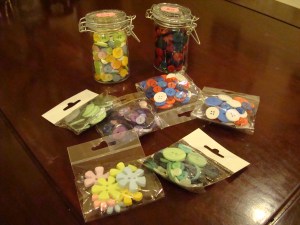 I’ve been looking at all the card designs you can make with buttons, but buttons bought from local sewing shops are SO expensive, so I bought lots of different sets of buttons to use for cardmaking (see photo below).