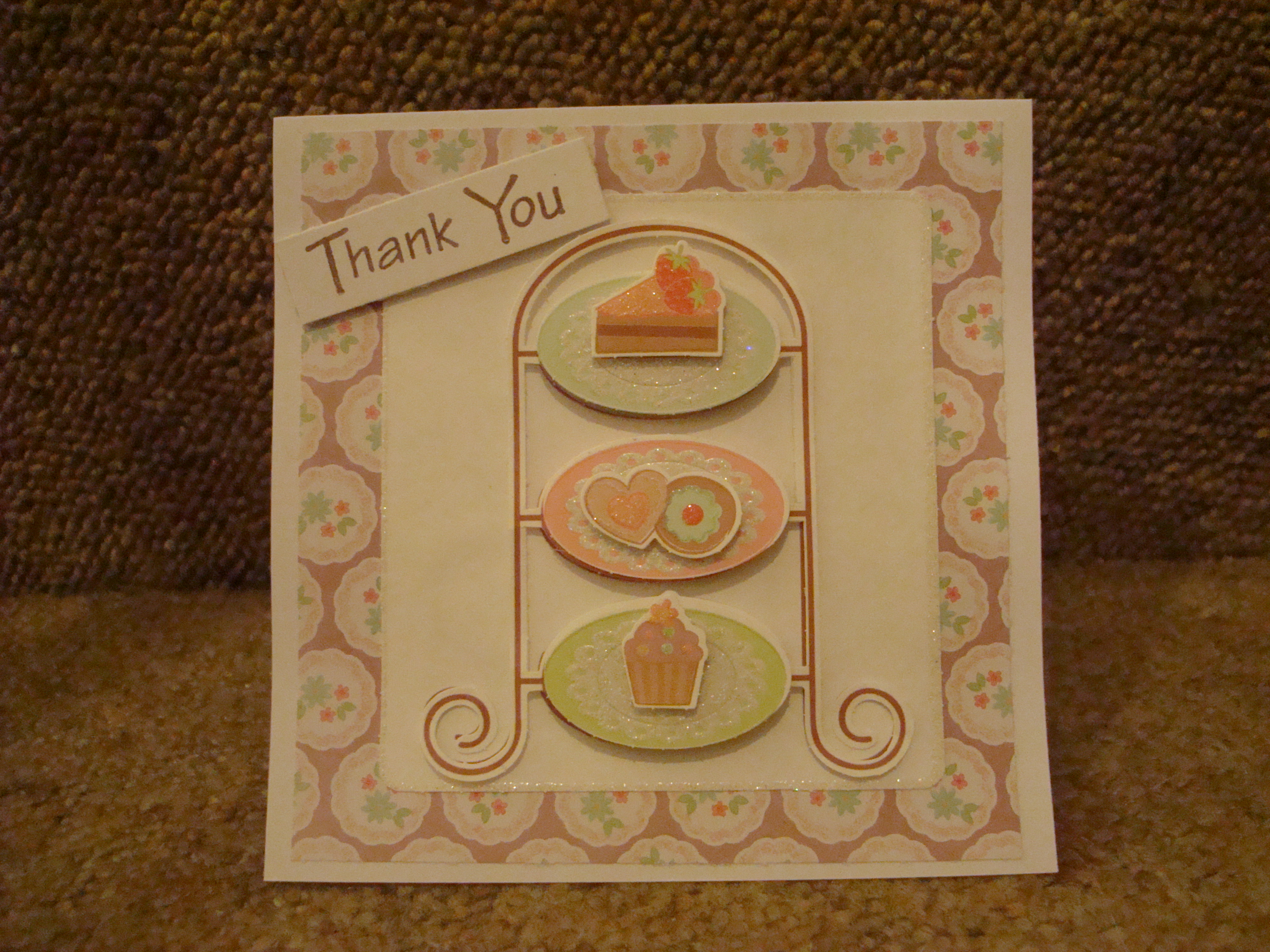 I made this card with a white base card and used the designer paper and decoupage set of Dovecrafts’s ‘Tea Party’ (using less glue than for my niece’s card!!).