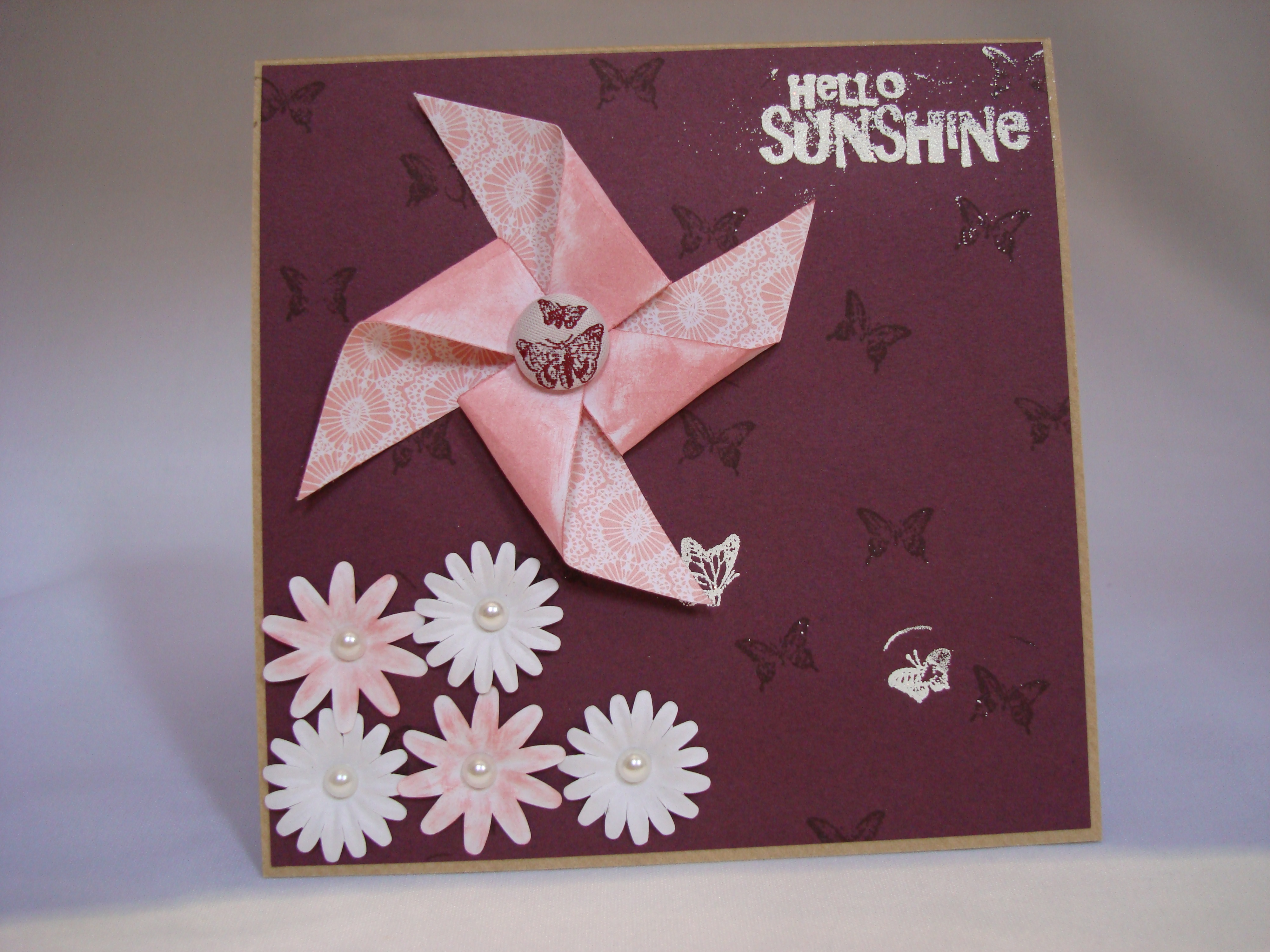 I used a Kraft base card, cut some dark purple paper to the right size, stamped it with a butterfly stamp in VersaMark Sepia ink. Then I cut a square of paper from the Docrafts Tea Party paper stack and cut in to the centre from the courners. After coluring in the back of the square with VersaMagic pink chalk I bent the courners over to create the pinwheel and pinned with a brad from the Beautiful collection. I used some Papermania Petals and coloured them with chalk too. I stamped the sentiment from Whimsy Stamps and two more butterfly stamps in VersaFine Watermark ink and then added white embossing powder, shook off the excess and used my heat gun. Then I stuck it all together and added pearl gems to the centres of the flowers.