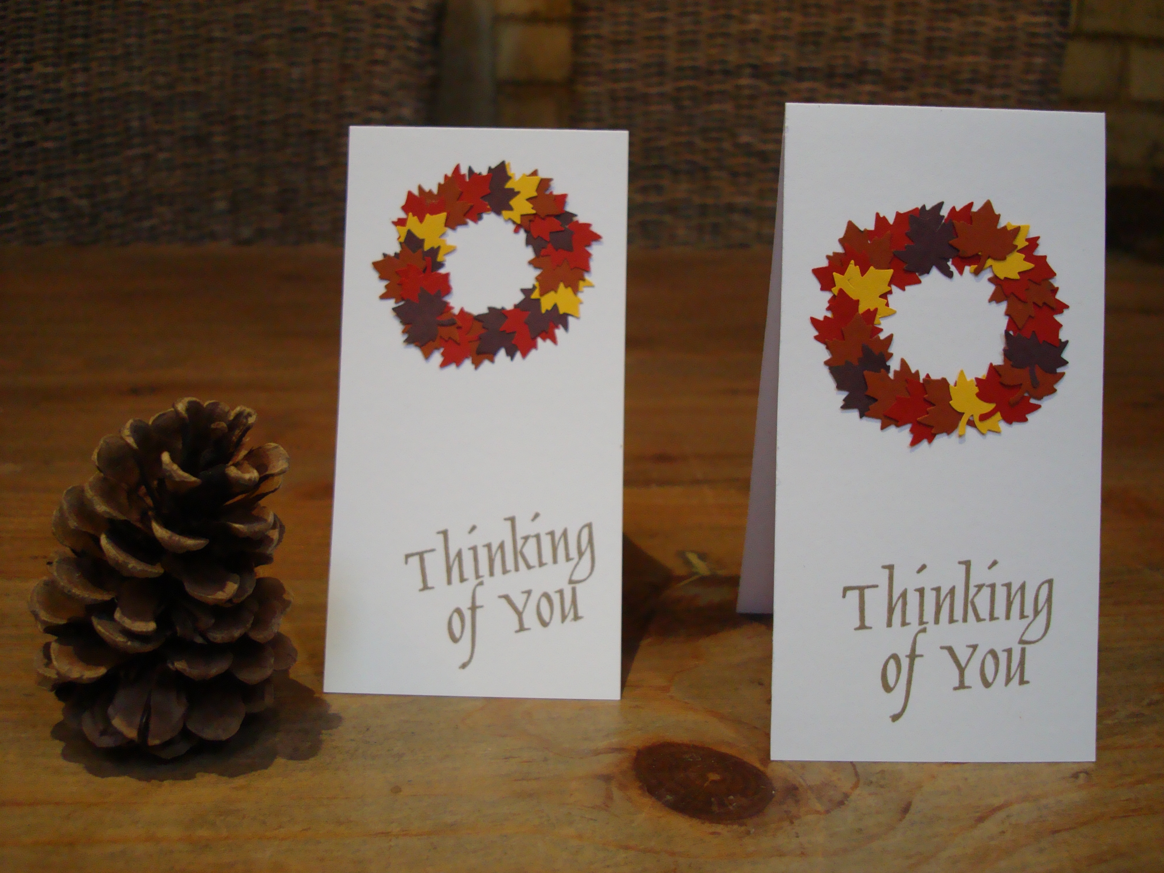 I’ve had a leaf punch from HobbyCraft for almost a year, I bought it with the aim of sticking some ‘Autumnal leaves’ to a project I never got round to starting, so I had quite a few pre-punched purple, yellow, brown and dark red leaves in my stash. I punched a few more leaves from the sheets of card I had used last time and then started to work out how I wanted my wreath to look (ie. would it be one of each colour in a pattern or random…). Once I was happy with a random colour scheme I drew a pencil circle on the card where I wanted to have the wreath (don’t try to stick the leaves on free-hand or you could end up with an oval- or egg-shaped wreath!!!) I grabbed punched leaves at random & used roll-on permanent glue to attach them to the circle (TIP: if you are using punched-out leaves they look best if you put the next leaf over the ‘stalk’ of the previous one – you can see on both cards that I tried to change the direction the leaves were going at some point & the stalk bits on show doesn’t look as nice as the tips of the leaves).