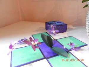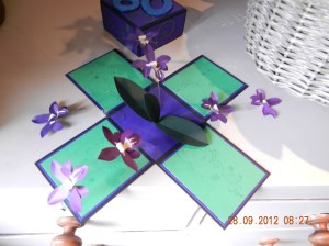 I was asked to make a birthday card/something for a friend of the family and decided to make her an exploding box with paper orchids (I had to work out how to construct them myself, so see my previous post for how I did that). Having had lots of notice of her birthday, but no inspiration until quite late I didn’t leave myself much time to make it, so even though this was the last week of my contract at work, my boyfriend and I split up and lots of other stuff going on in my life I had to really get going with this or it would be too late for her birthday party! I worked on this for a few evenings, but ended up working until midnight on Thursday to get this project done, so it was very last minute (not what I would reccomend) and I took the photos on the Friday morning, but I’ve only just had the chance to write this post now.