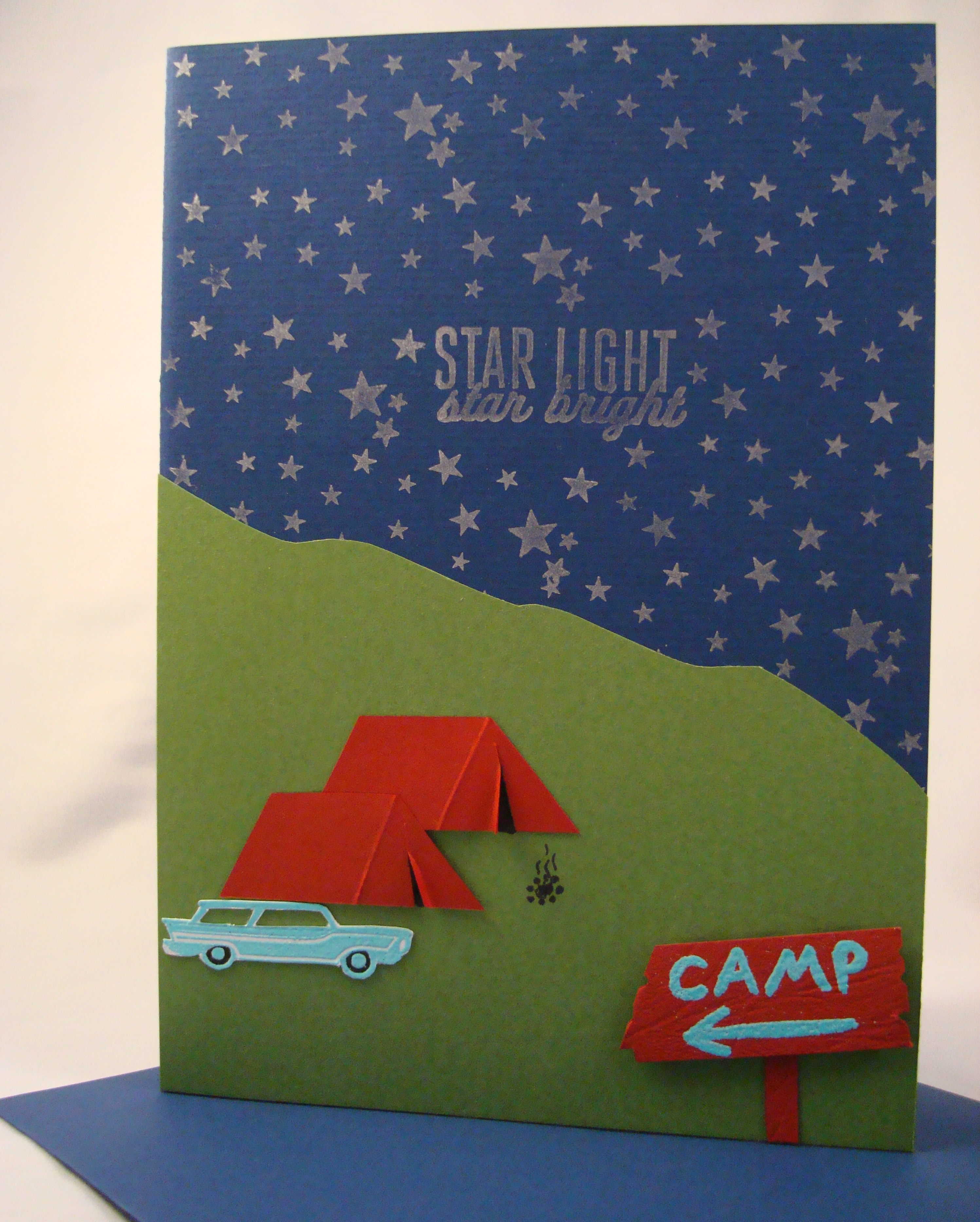 I got some red card, also from my stash and cut two ‘tent’ shapes and scored the card to make the tent, cut a slit to make the tent opening and attached to the card with double-sided tape and some mini foam pads so the tent openings were further out from the card than the back.