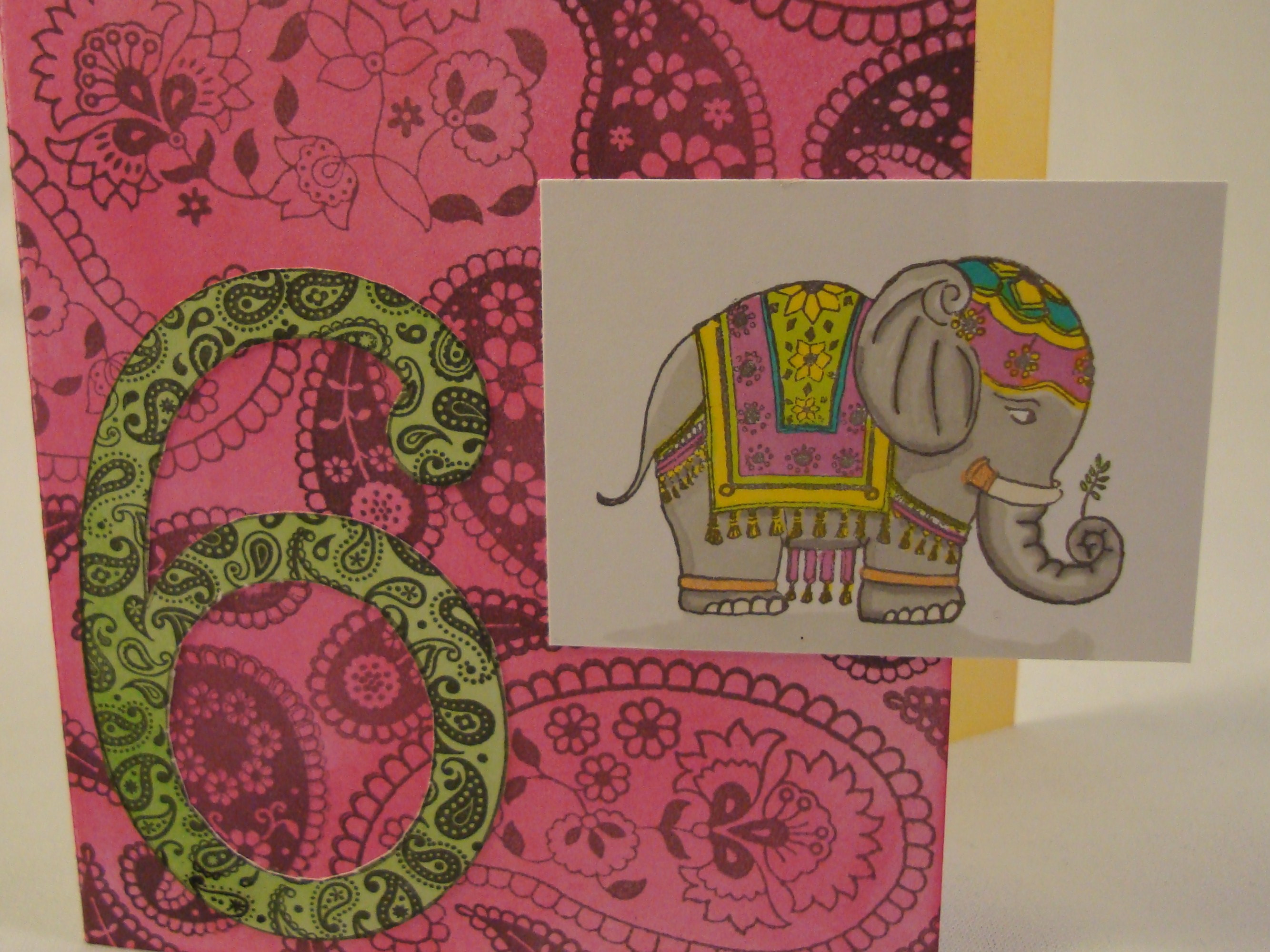 Because of the book and the summer colour palette there was only one thing I could do – break out my trusty Stampin’ Up Paisley Party Stampin’ Around wheel! I found a wood mounted decorated elephant stamp and stamped that onto some super smooth white card. I cut a rectangle around it with my guillotine and then coloured it in with my Promarkers Summer 2012 Limited Edition set and cool greys. I stamped a ‘6’ in black ink and then ran my Paisley Party Stampin’ Around wheel over it, then inked it with Distress Ink ‘Mowed Lawn’. When the ink had dried I cut out the 6.