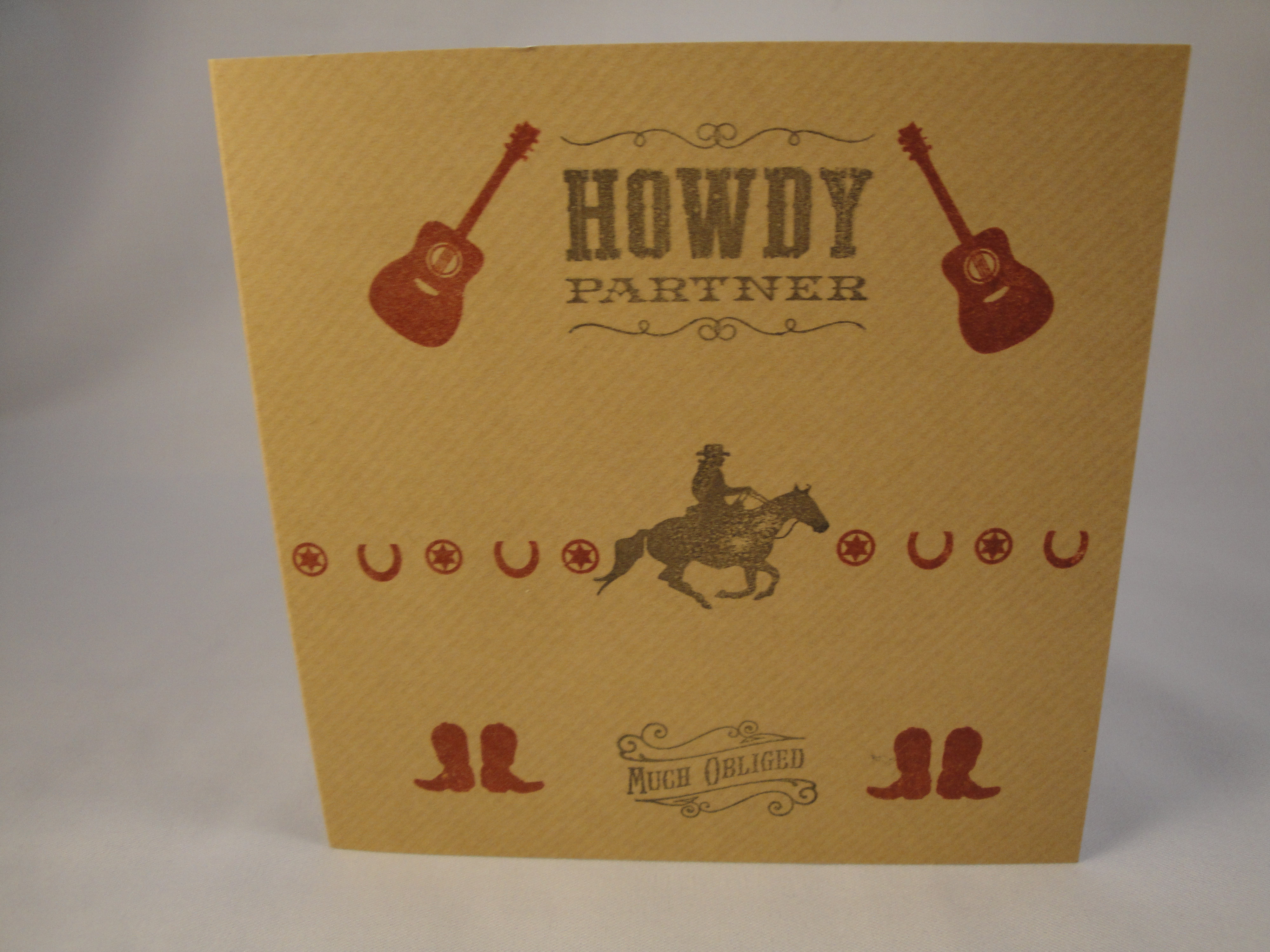 The first card I made was for a man friend of mine, so I thought the Back in the Saddle set would work really well – a great masculine theme. I used my SU! Raspberry Ripple In Colour and black ink pads. I wanted to use my Kraft cards and envelopes to tie in with the ‘Wild West’ theme.