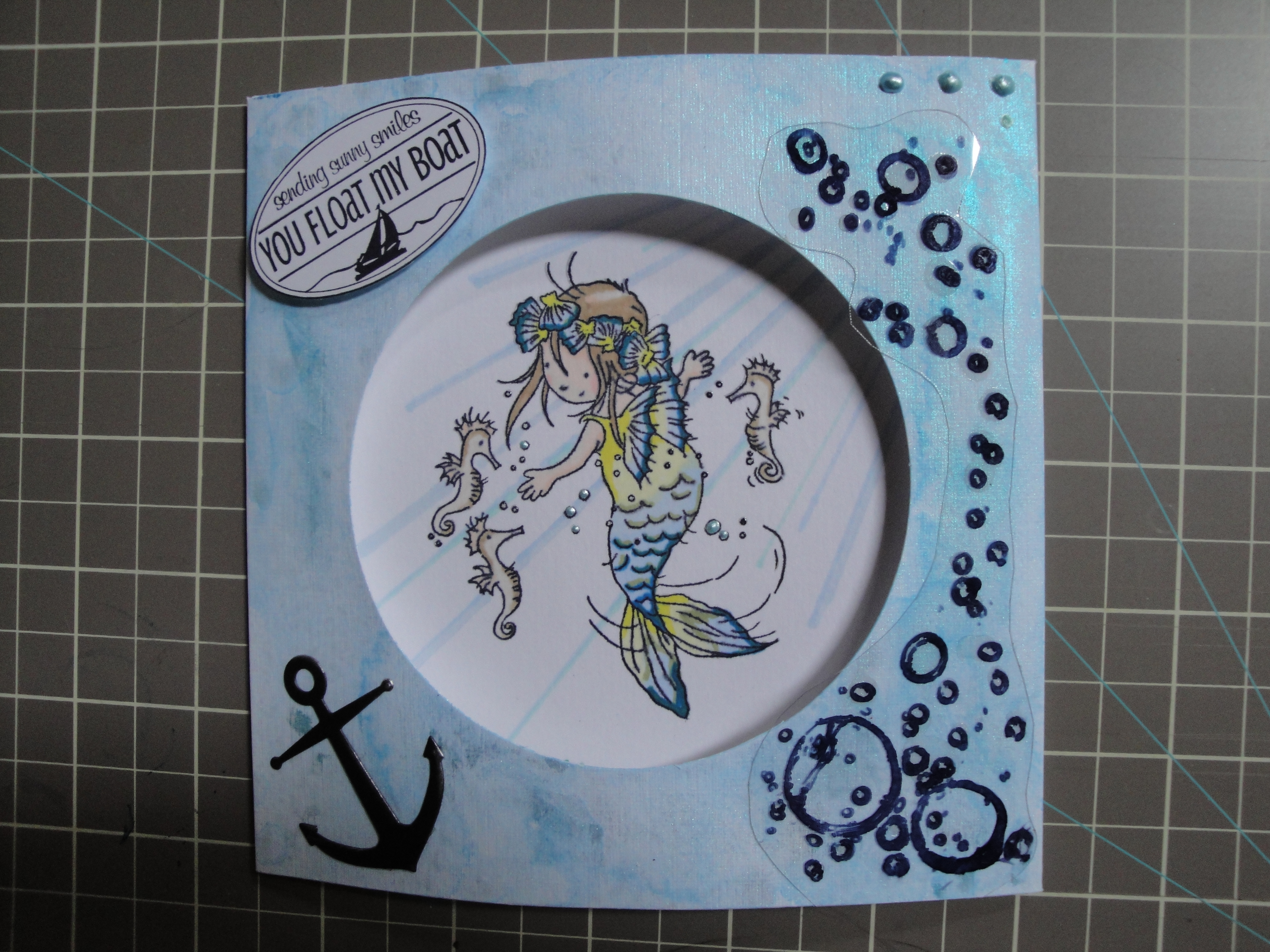 I cut around the acetate bubbles and attached them to the front of the card with Glossy Accents (Ranger) and attached the anchor die cut with double sided tape. Last of all I attached the oval sentiment with foam pads to give dimention to the card.