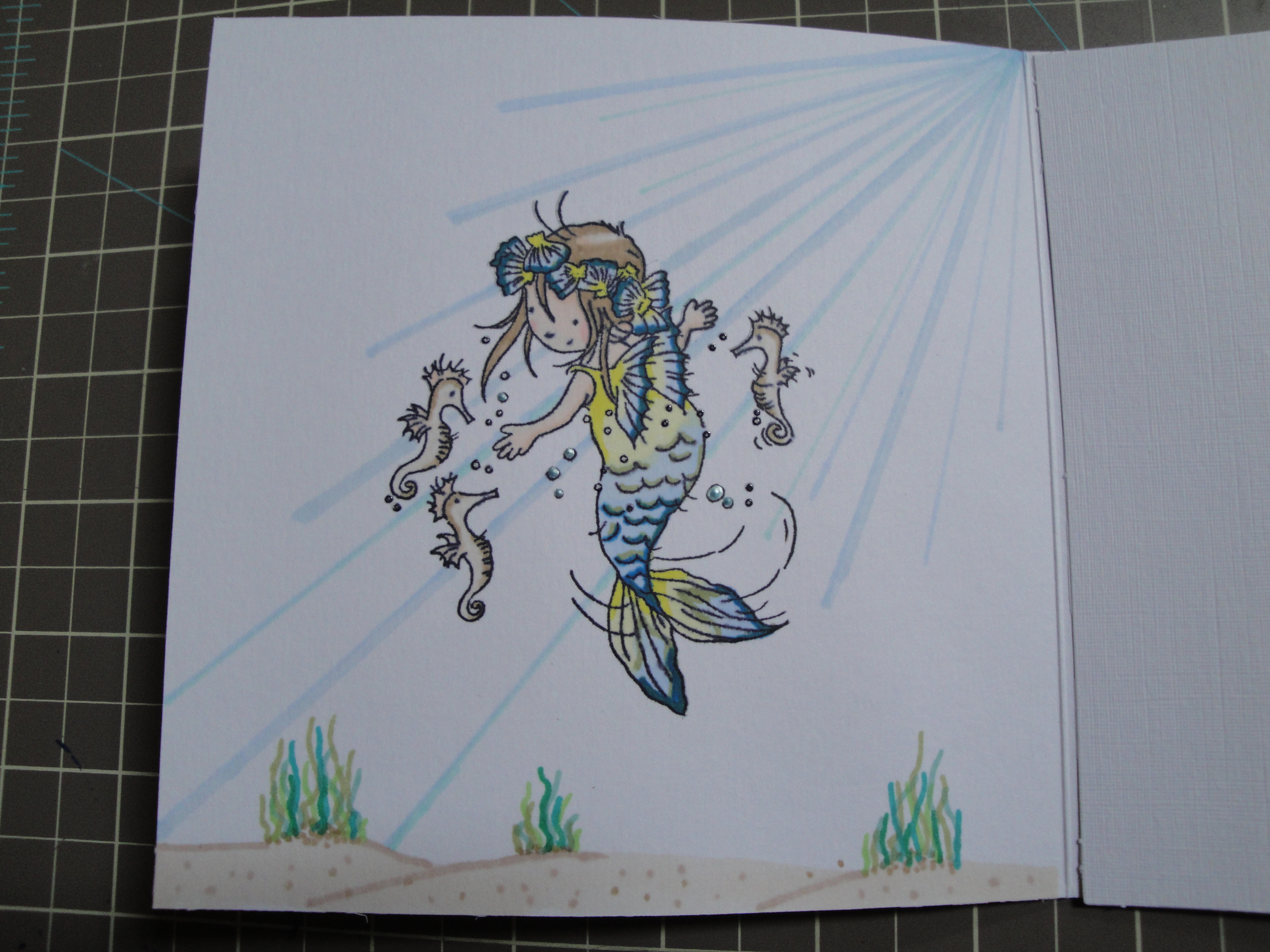 I coloured the mermaid with my Promarkers and attempted to get that ‘sunlight through water’ effect behind her and drew the sea bed with some seaweed below her. To emphasise the bubbles in the image I added tiny dots of Liquid Pearls in Baby Blue (Ranger) to them.
