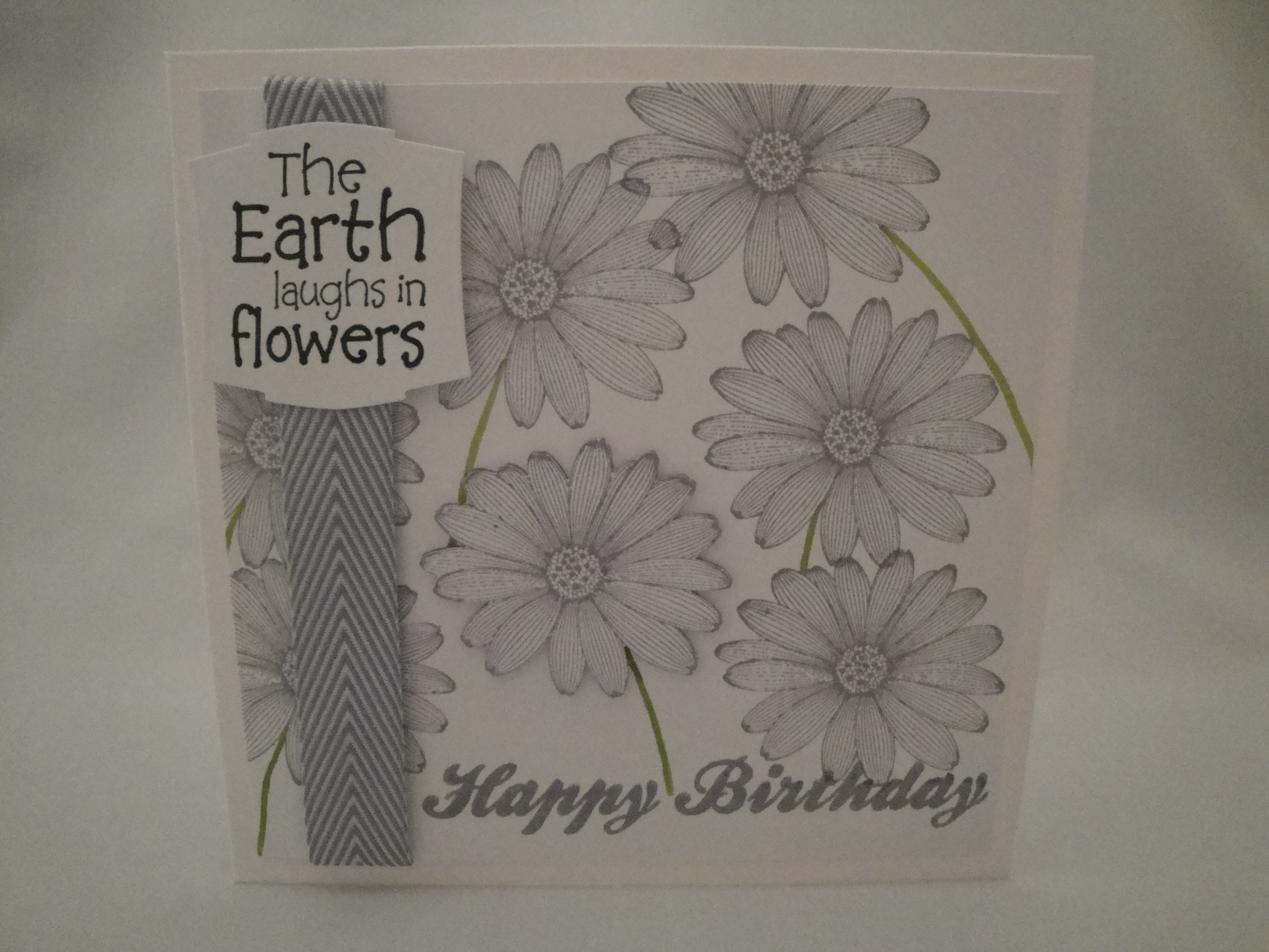 I started out with a white 6 x 6 card for the base. I took a piece of extra smooth A4 stamping card grabbed my Hero Arts ‘Etched Daisy‘ wood mounted stamp and the ‘Happy Birthday’ sentiment from IndigoBlu’s ‘Mr Fan-tash-tic’ set and inked them up with Stampin’ UP! Wisteria Wonder ink. I lined up the sentiment along the bottom of the page, then stamped the daisy randomly until I had covered an area about the same size of the card. I drew in stems for the daisies with my Lucky Limeade Stampin’ Write Marker. Then I cut the stamped card to fit over the front of the card, but with a 0.5 cm border around the edge.