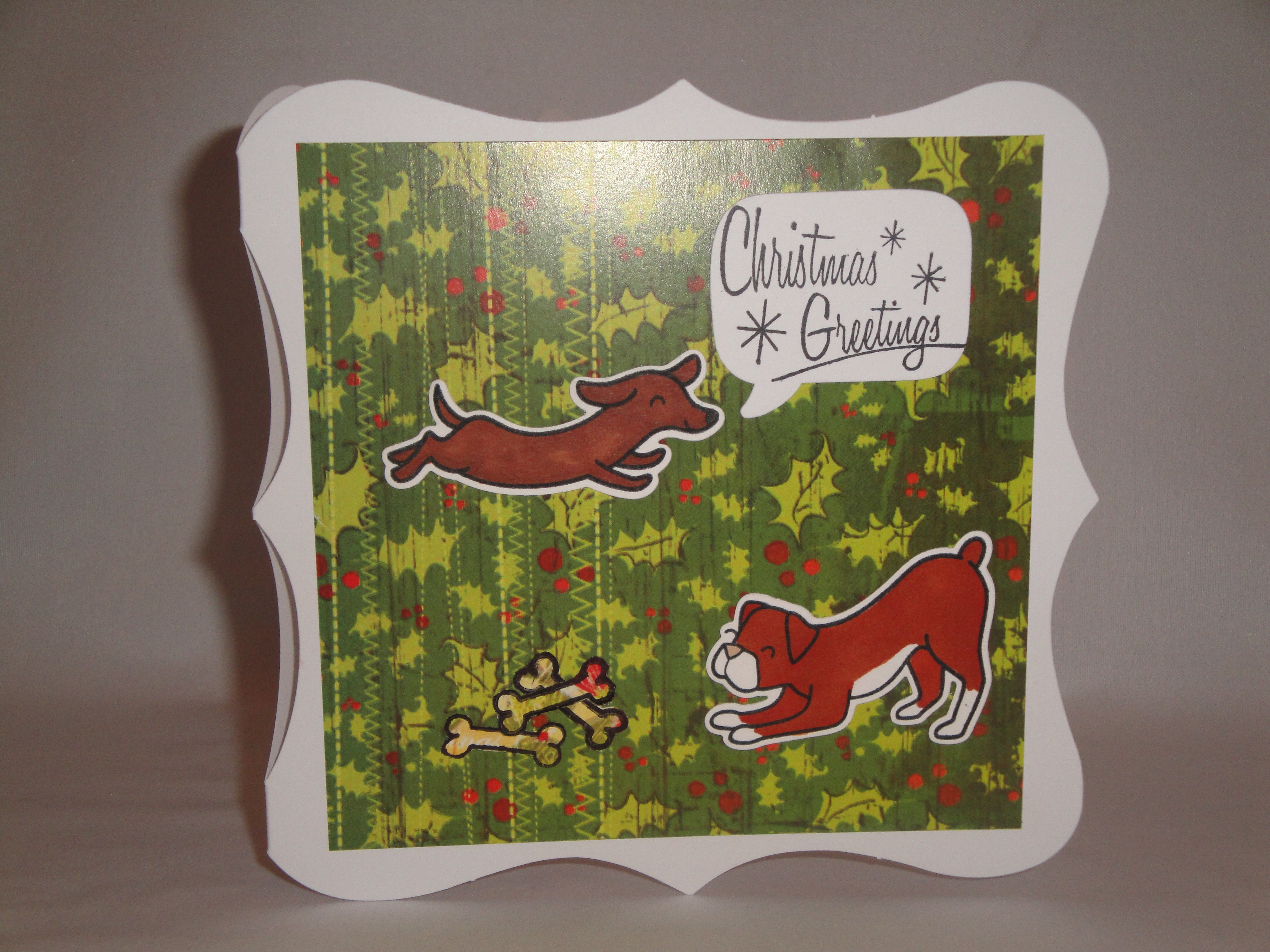 Next I went through all the packs of papers that had come free with Cardmaking and Papercraft and found the ‘Berry Merry’ by Jennifer Ellory set of papers & thought it would make a nice ‘Christmassy’ background. I also stamped the bone from the Critters at the Dog Park set on some and cut them out to make ‘wrapped presents’.