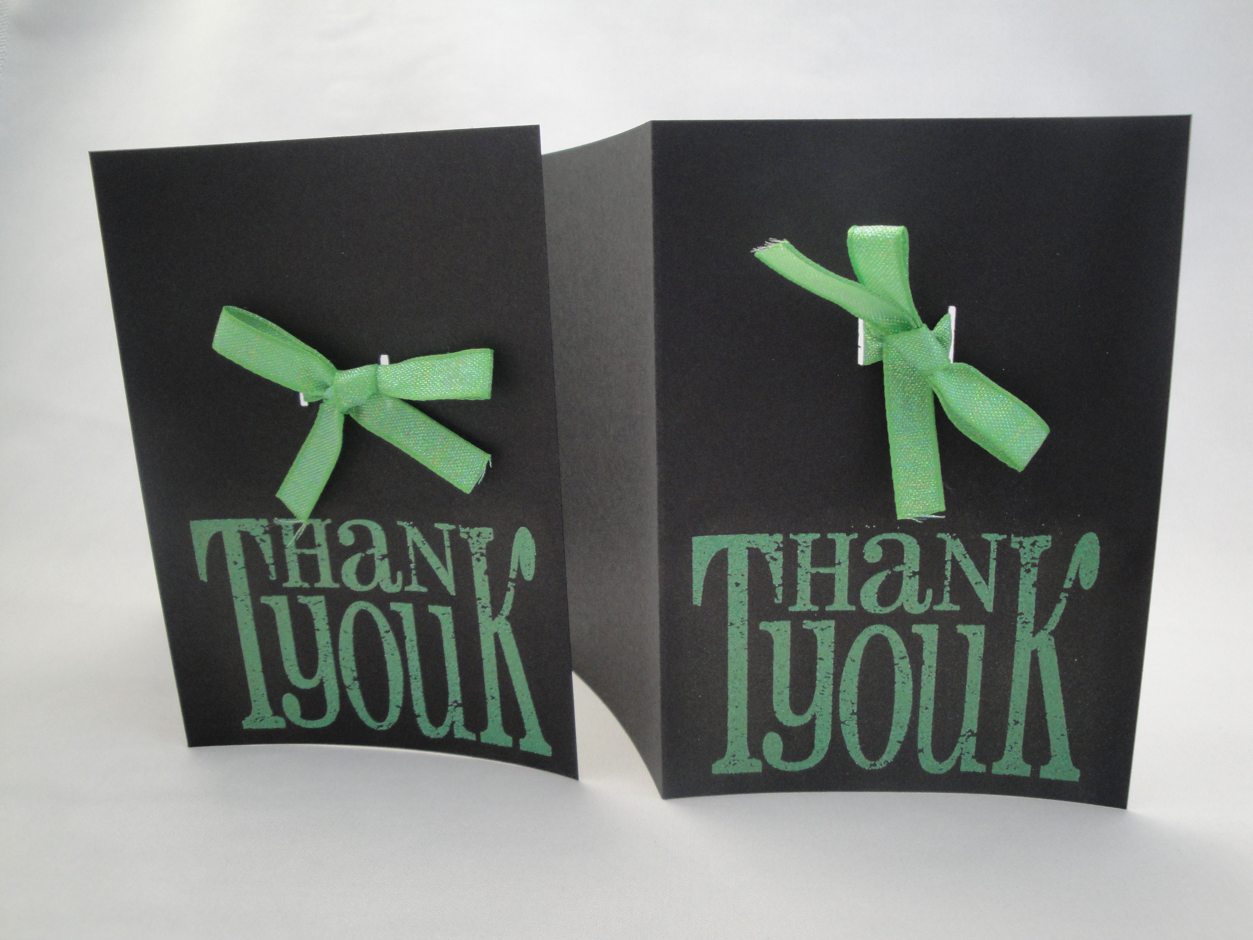 Next I have an American Crafts premium ribbons set (I think it’s called boutique, but I’m not sure) and in the set was a sparkly green ribbon that was just right to match the embossing powder. I cut two slits in the card fronts with my craft knife to thread the ribbon through & then tied a bow (a bit like a present) above the sentiment.