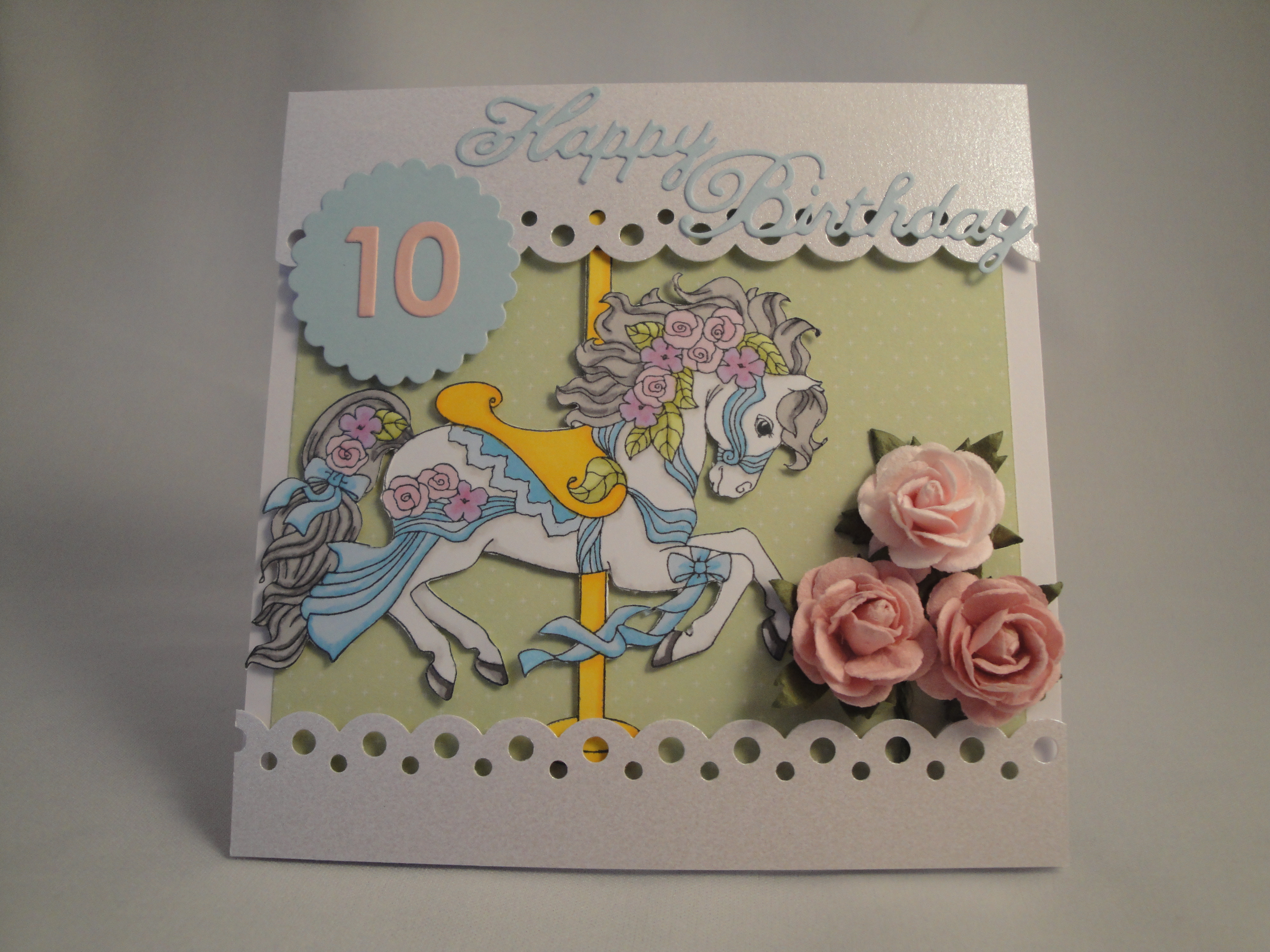 Next I used my Martha Stewart ‘Double Scallop‘ edger punch to create a carousel top & bottom section using Centura Pearl card. I used the Spellbinders Scalloped Circle die with pale blue card and Cheery Lynn ‘Happy‘ and ‘Birthday‘ dies with the same card. I found some pink card and die cut out the 1 and 0 from the Memory Box ‘Parker Numbers‘ dies.