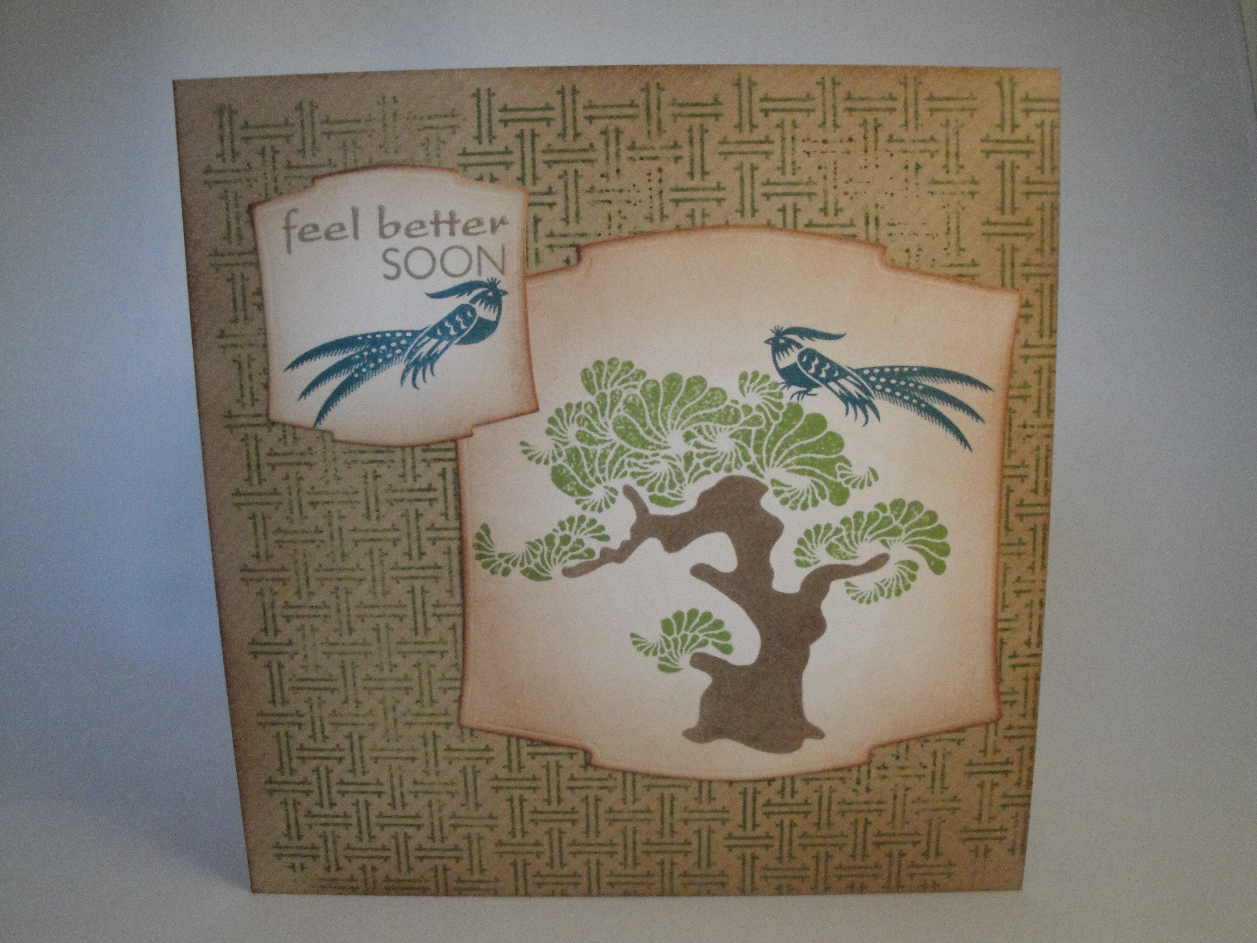 I started out with a kraft 6×6 base card and envelope. My Granny has a beautiful Chinese cabinet that she loves, so I wanted to re-create it on the card. I used the Waltzingmouse ‘Asian Gardens‘ stamps.