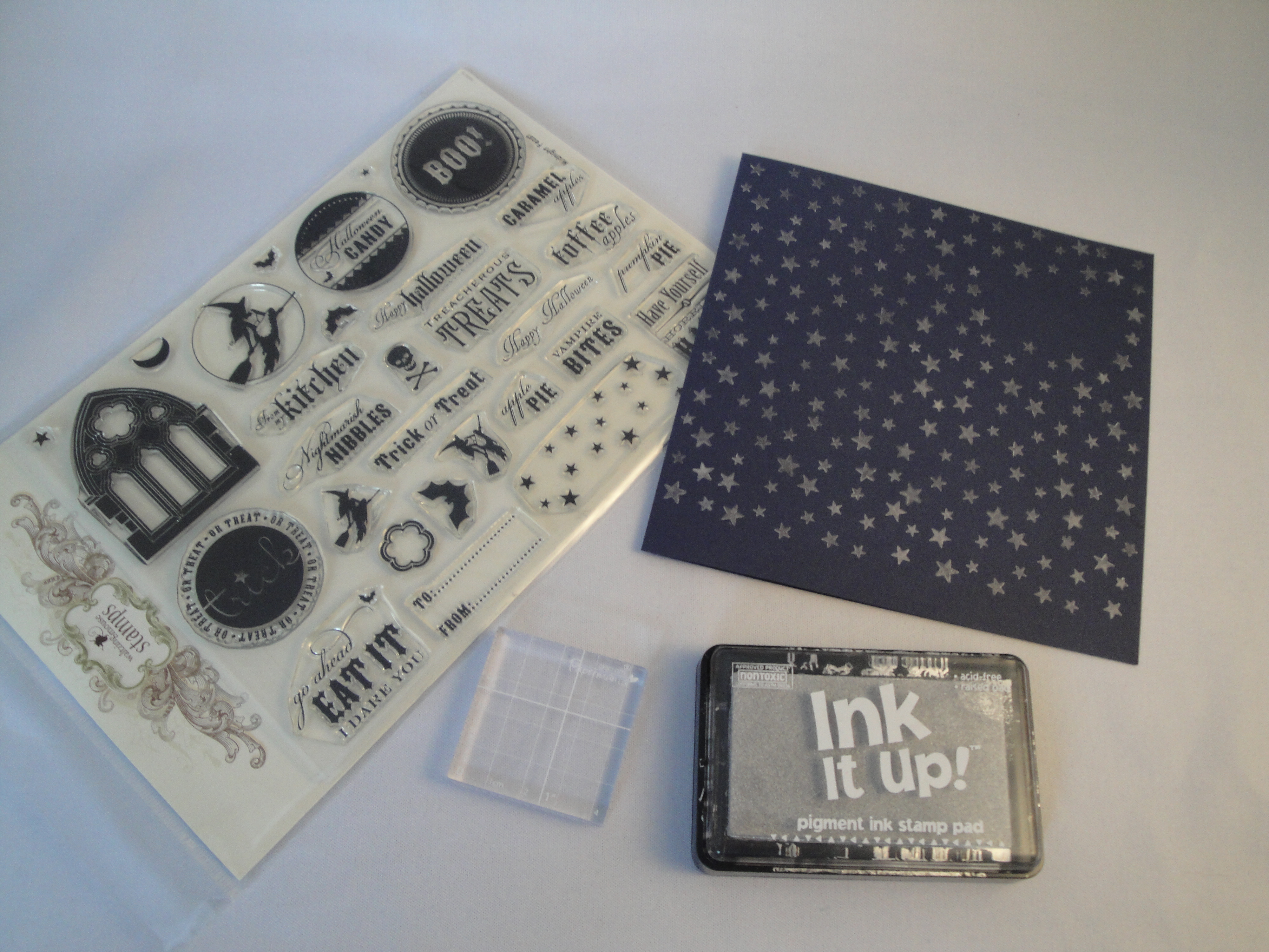 I used a dark blue square base card and stamped the stars from Waltzingmouse Stamps ‘Midnight Feast‘ on it in silver ink.