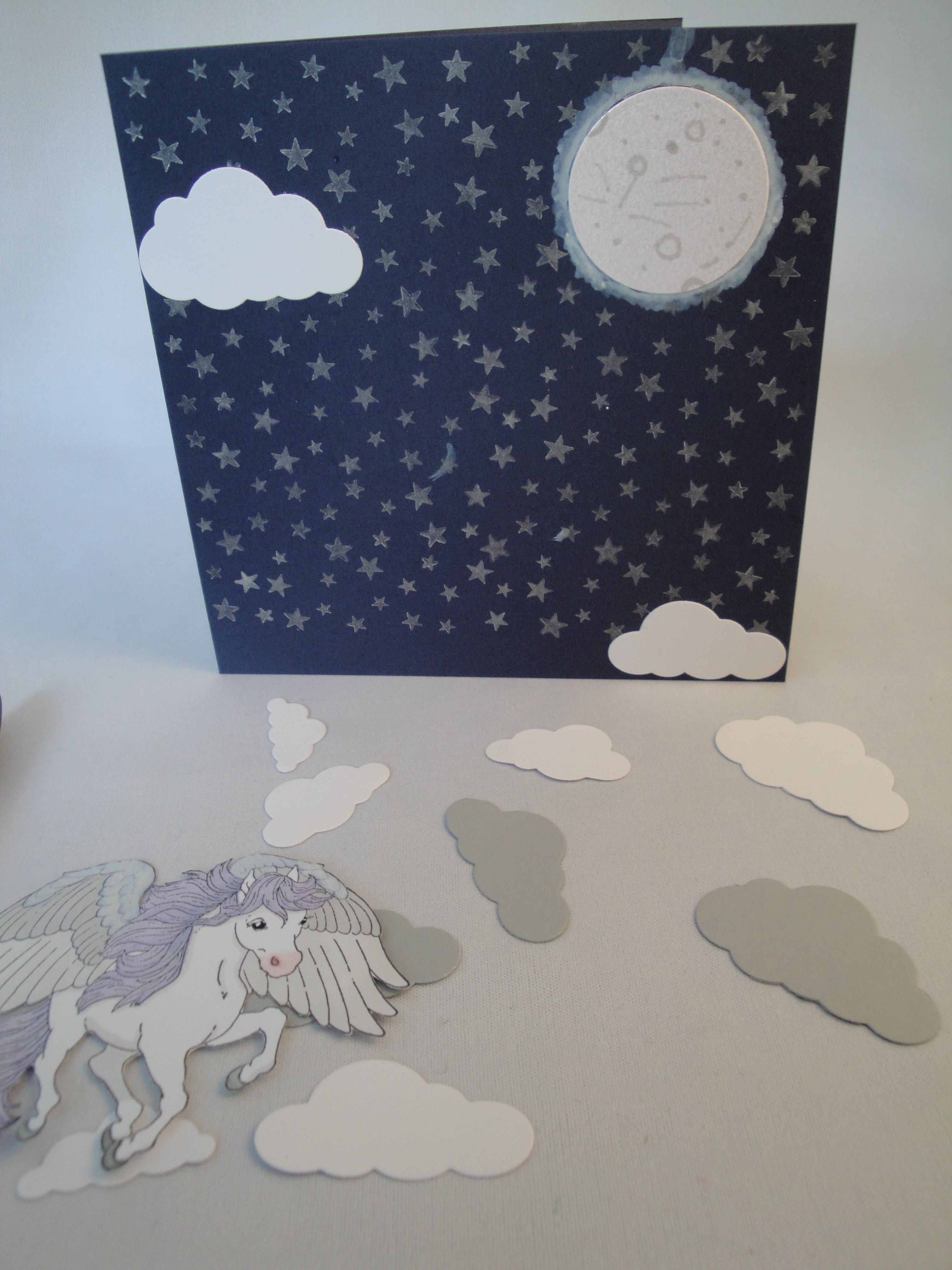 Next I cut out a circle from white Centura Pearl cardstock and drew on some craters & valleys so it looked like the moon. I drew around it with my new Wink of Stella Brush GL.WHITE 000. Unfortunately you can probably see I got some of it where I didn’t want some white glitter!!! So I die cut some clouds using Memory Box and Joy! Crafts Clouds dies from white and grey cardstock & strategically positioned them over the mistakes!