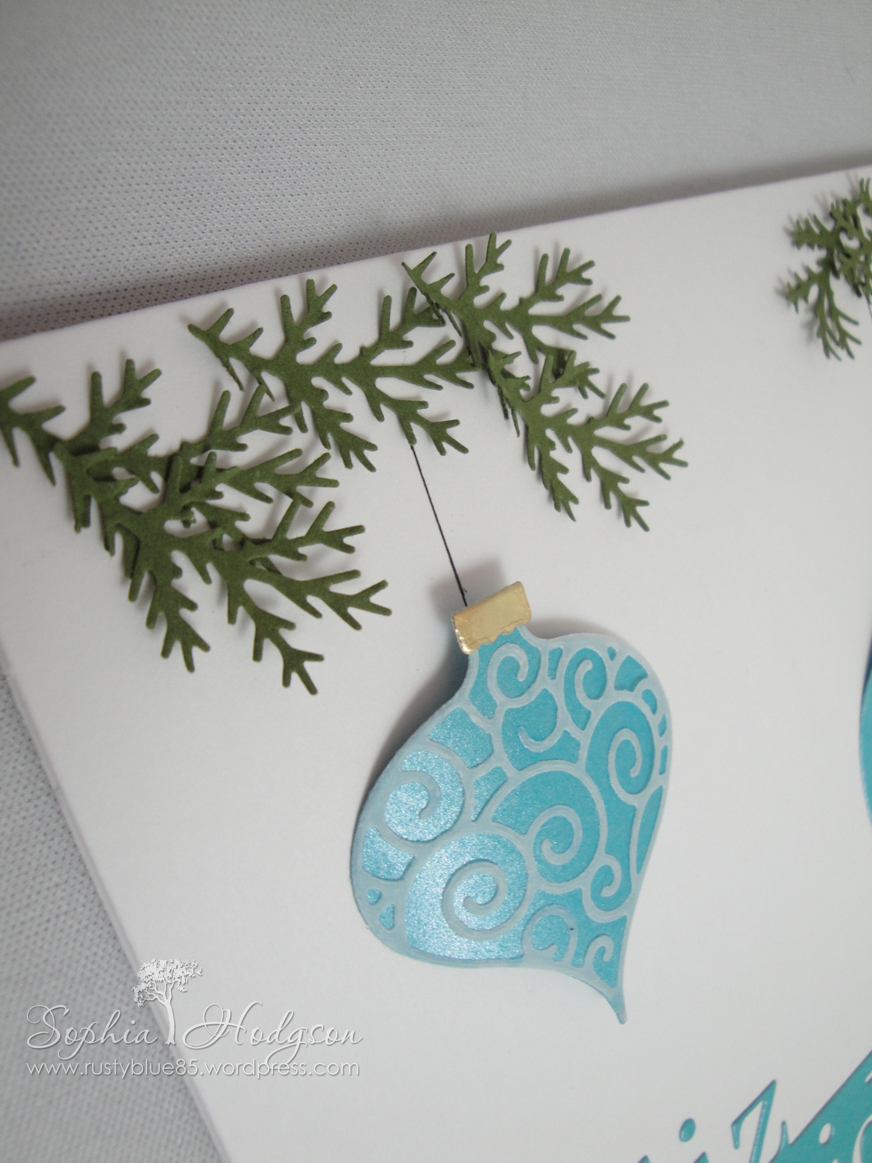 I used some metallic teal card to cut the sentiment and solid baubles, then I cut the ‘Swirl Ornament’ from some velum. Using the top of the ‘Classic Ornament’ I cut two tops from gold mirror card. I cut several branches from Mossy Meadow card stock using my Martha Stewart ‘branch’ punch.