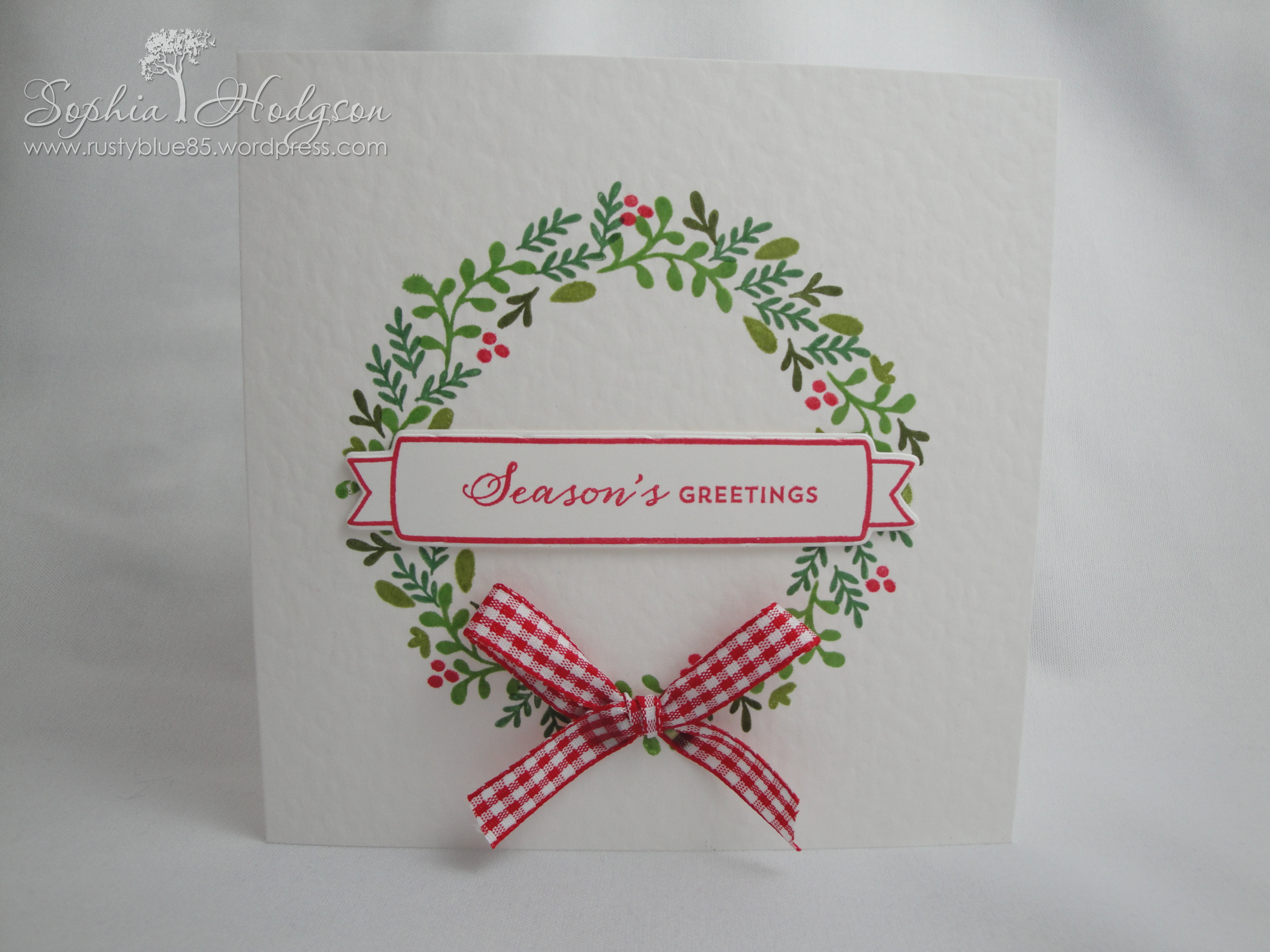I thought I had a die that looks like a bow, but I couldn’t think what set it was in, so I used some red gingham ribbon and attached it to the front of the card with Glossy Accents (Ranger).