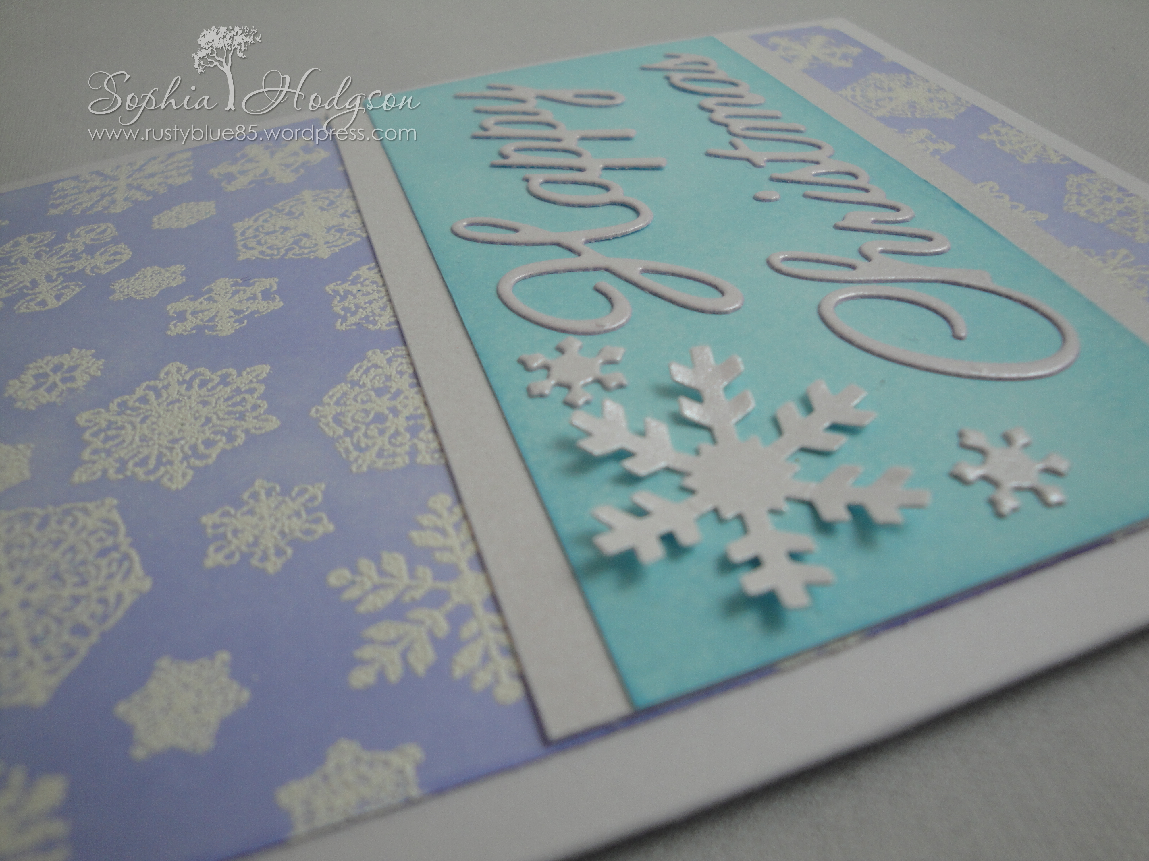 The largest snowflake is a punch, the other snowflakes are from the ‘Snowflakes’ die by Cheery Lynn Designs (C146). The sentiment and snowflakes were stuck on the blue sentiment panel with Quicky Glue.
