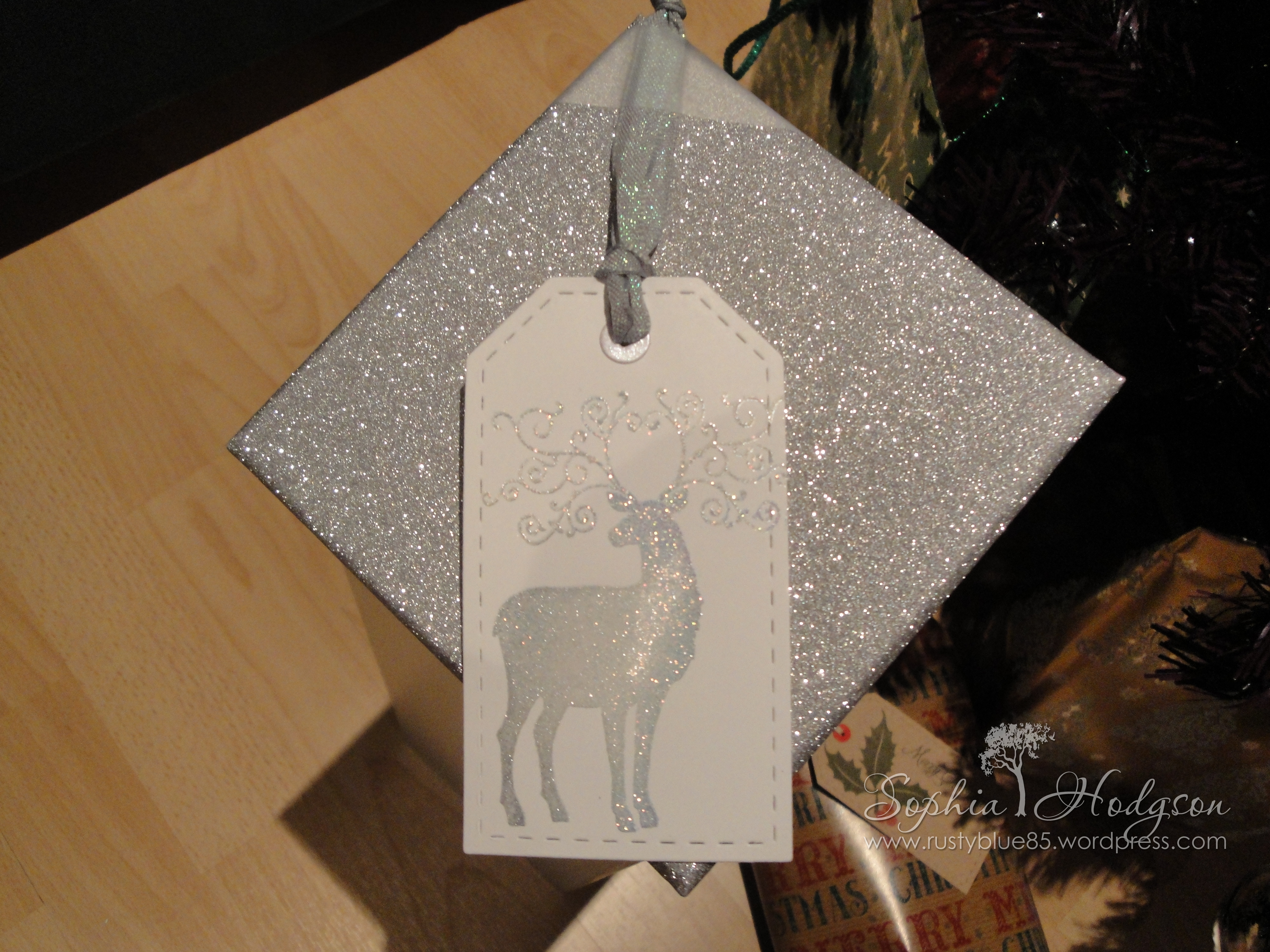 I also made a tag from the Stampin’ UP! set ‘Christmas Deer’, stamped in silver pigment ink, then heat embossed with Holographic embossing powder.