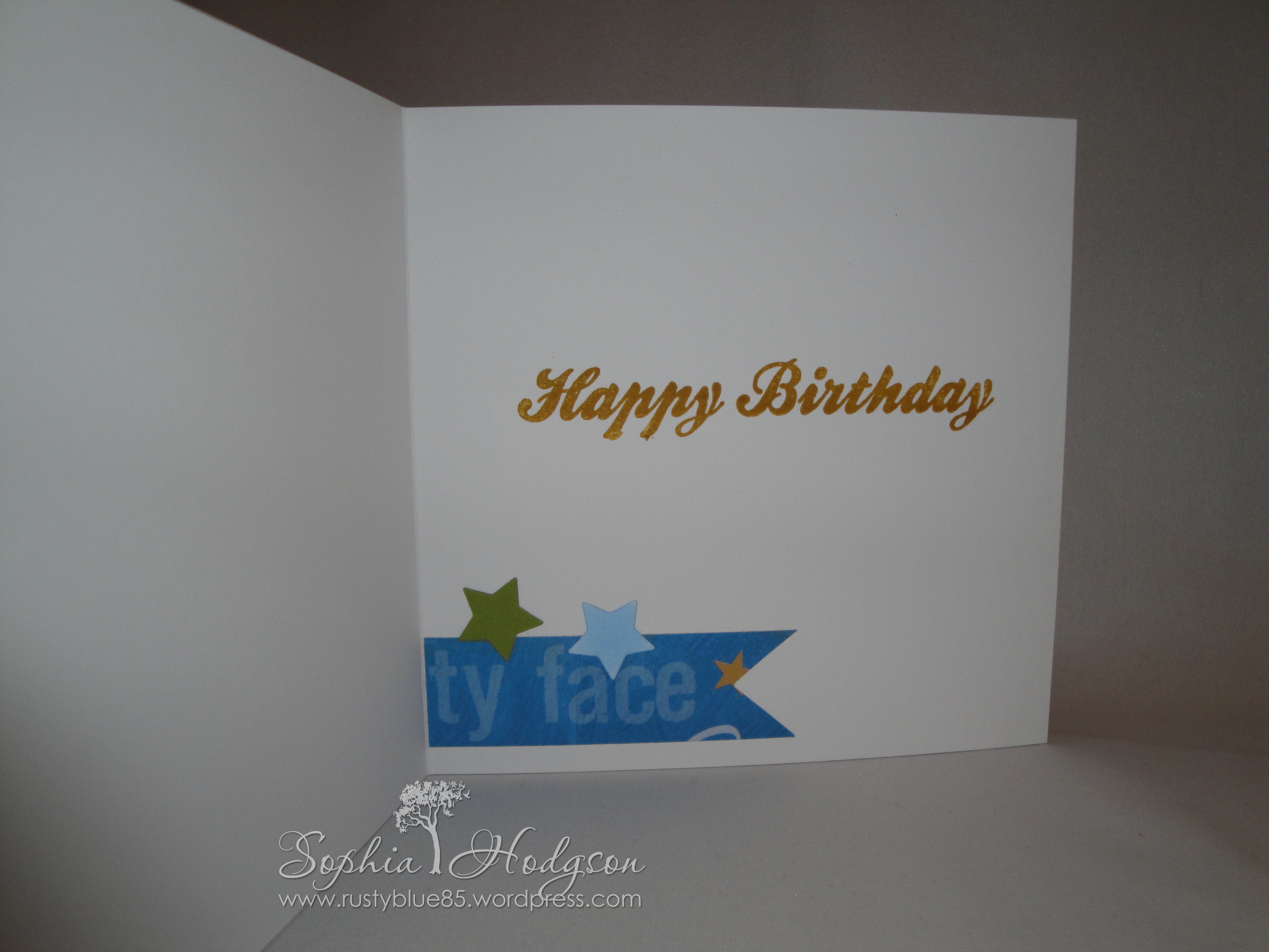 Next, I wanted to decorate the inside of the card (I don’t normally do this, but I thought it would be nice as the front is quite plain. I inked up my ‘Happy Birthday’ sentiment stamp from the IndigoBlu ‘Mr Fan-tash-tic’ set in Hello Honey SU! ink. I cut an 8.5cm x 1 inch section of the card I used on the front, then made a fishtail in it, and using roll-on glue I attached it to the inside of the card, then attached some stars over the top.