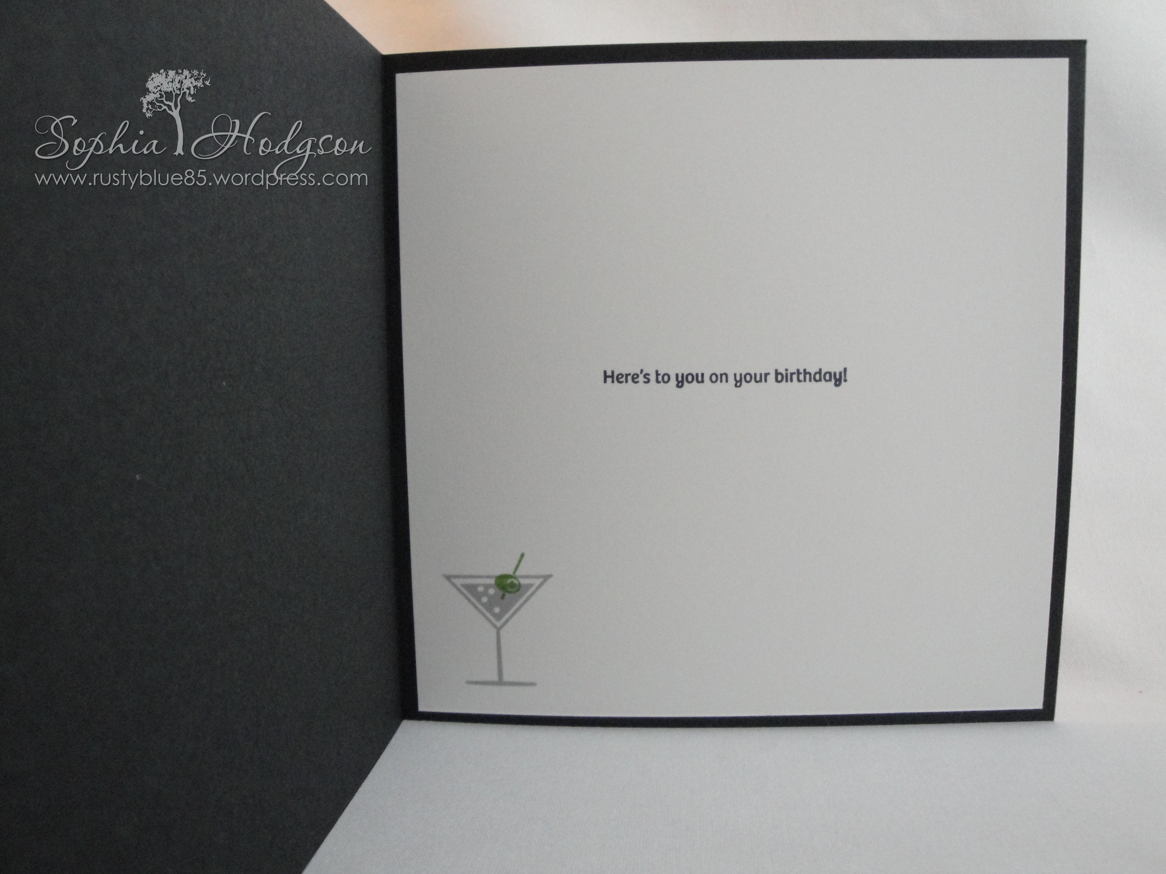 For the inside of the card I cut a white insert, stamped the sentiment from the Stampin’UP! ‘Happy Hour’ stamp set in black ink, then the Martini glass in Smokey Slate and the olive in Gumball Green.
