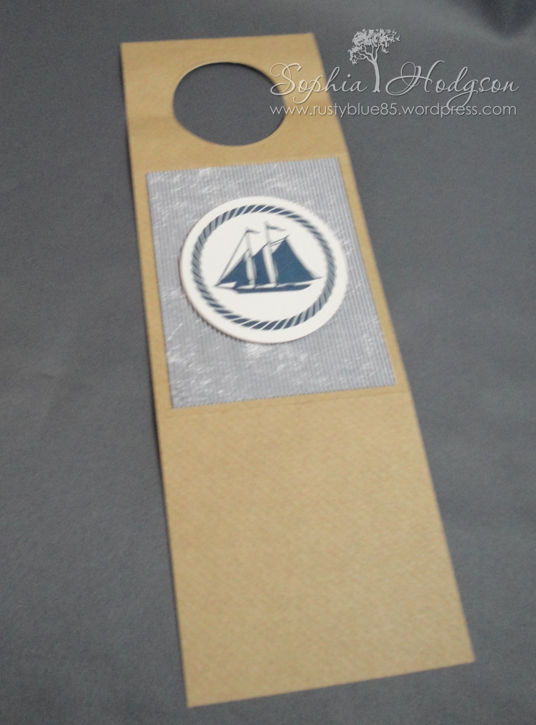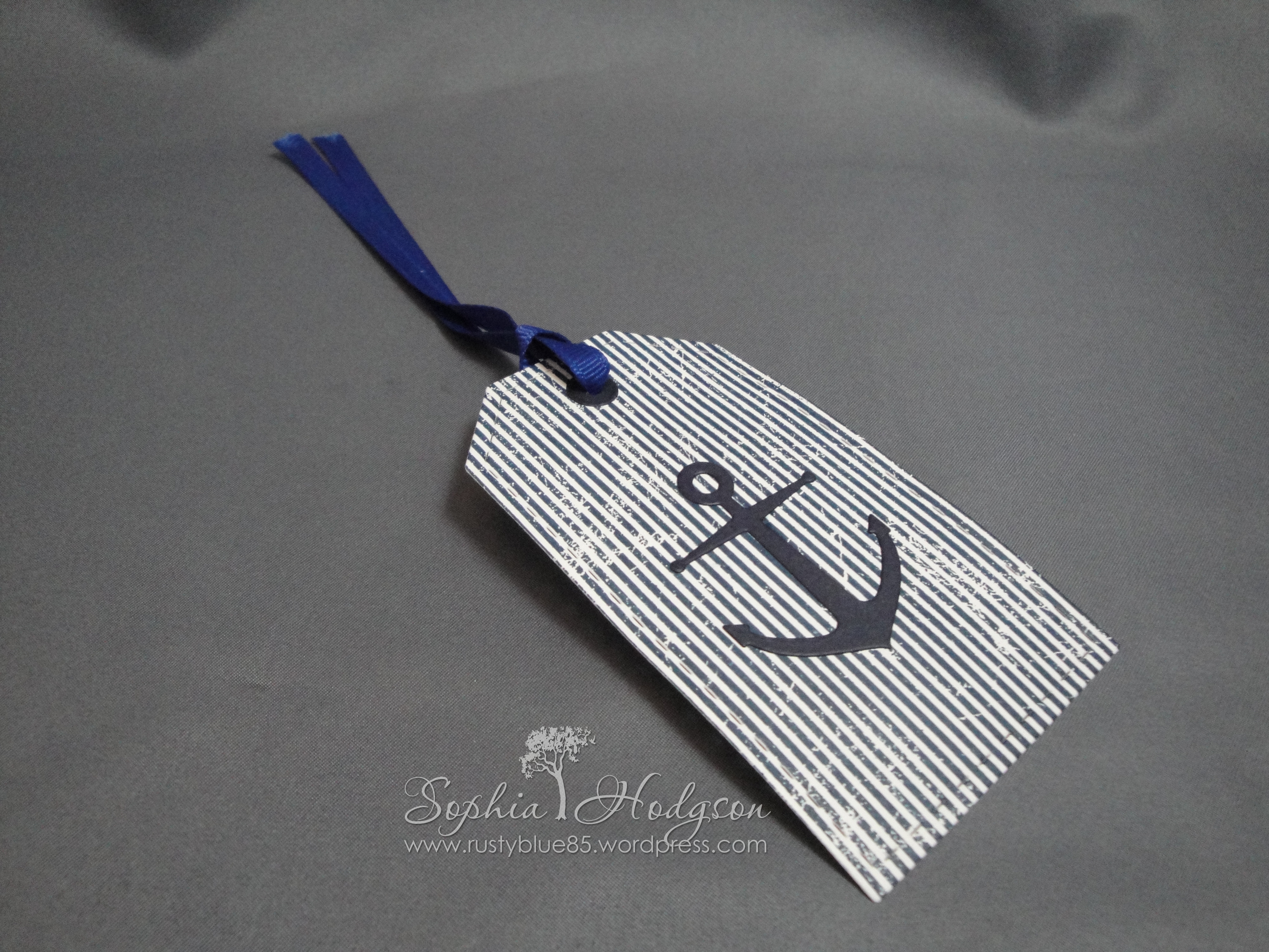 I used the WMS ‘Pinstripe Backgrounder‘ to stamp another piece of Whisper White card and cut out a luggage tag from it using the largest WMS ‘Stitched Tags‘ die. The gromits were cut from dark blue card, as well as the Memory Box ‘Majestic Anchor’. I attached the gromits and anchor with Quickie Glue pen.