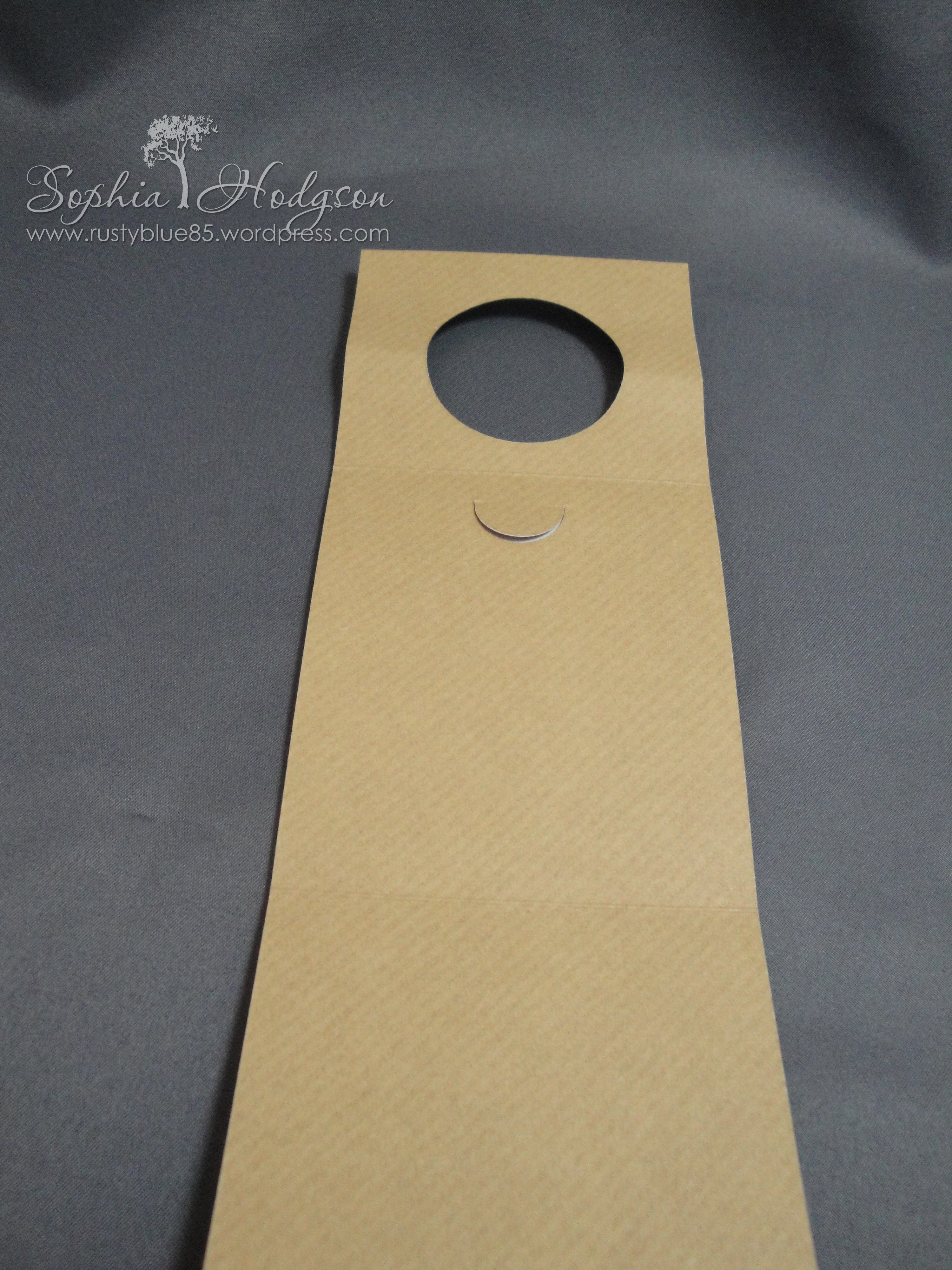 For the bottle tag I cut a vertical strip of A4 piece of kraft card 3 inches wide, then used the third smallest Spellbinders Classic Circles Small die to cut the hole for the bottle top at one end. At the end with the hole in I scored at 2.5 inches and again 3.5 inches from the first score line. Using the smallest of the Classic Circles Small I partially ran it through my Big Shot so only a semi-circle was cut from the card.