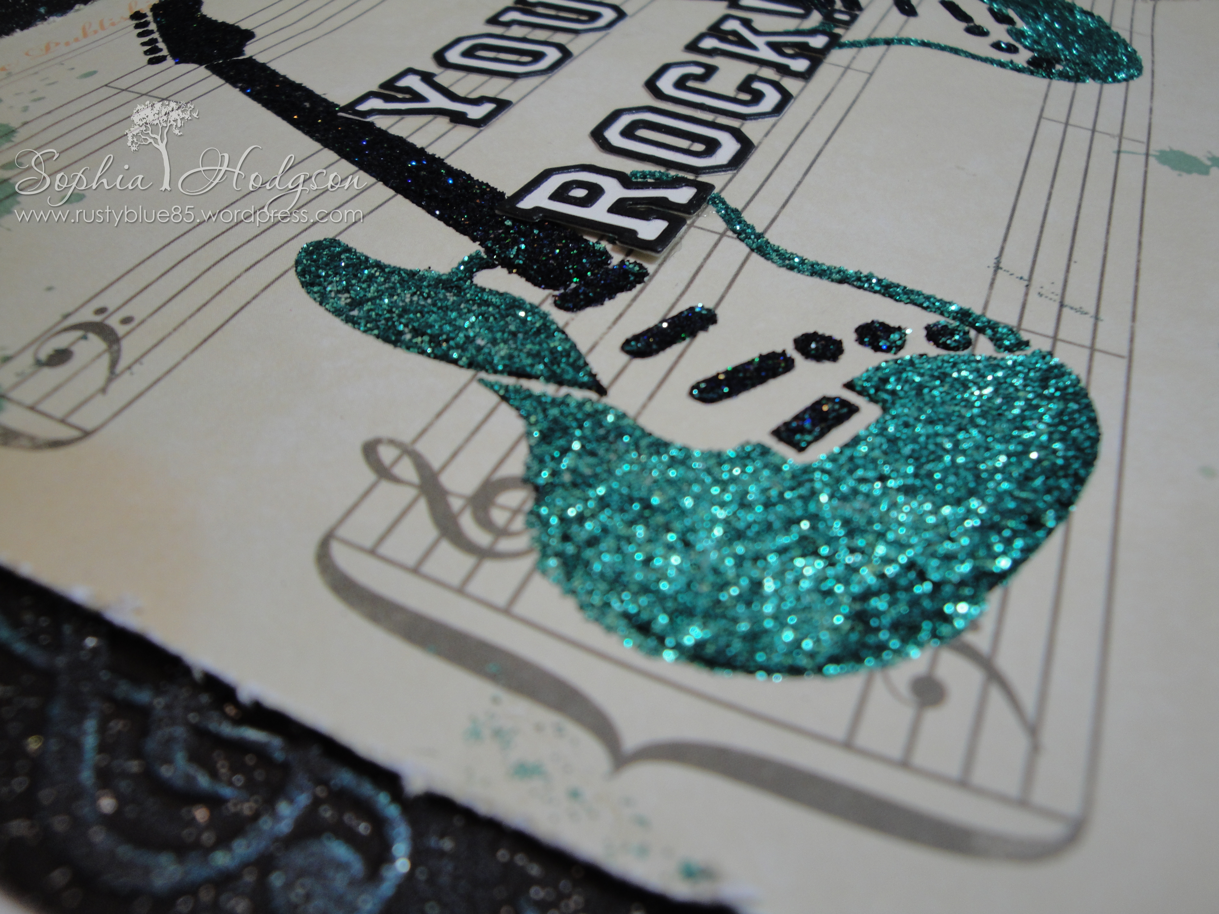 Next I cut a piece of patterned 12×12 paper from the DIY Shop paper pad down to 6 1/2 x 6 inches and used the Dreamweaver stencil ‘Electric Guitar’ and Imagination Crafts Sparkle Medium in ‘Black Stars’ and Cosmic Shimmer Sparkle Texture Paste in ‘Ocean Spray’ to put two guitars on the paper.