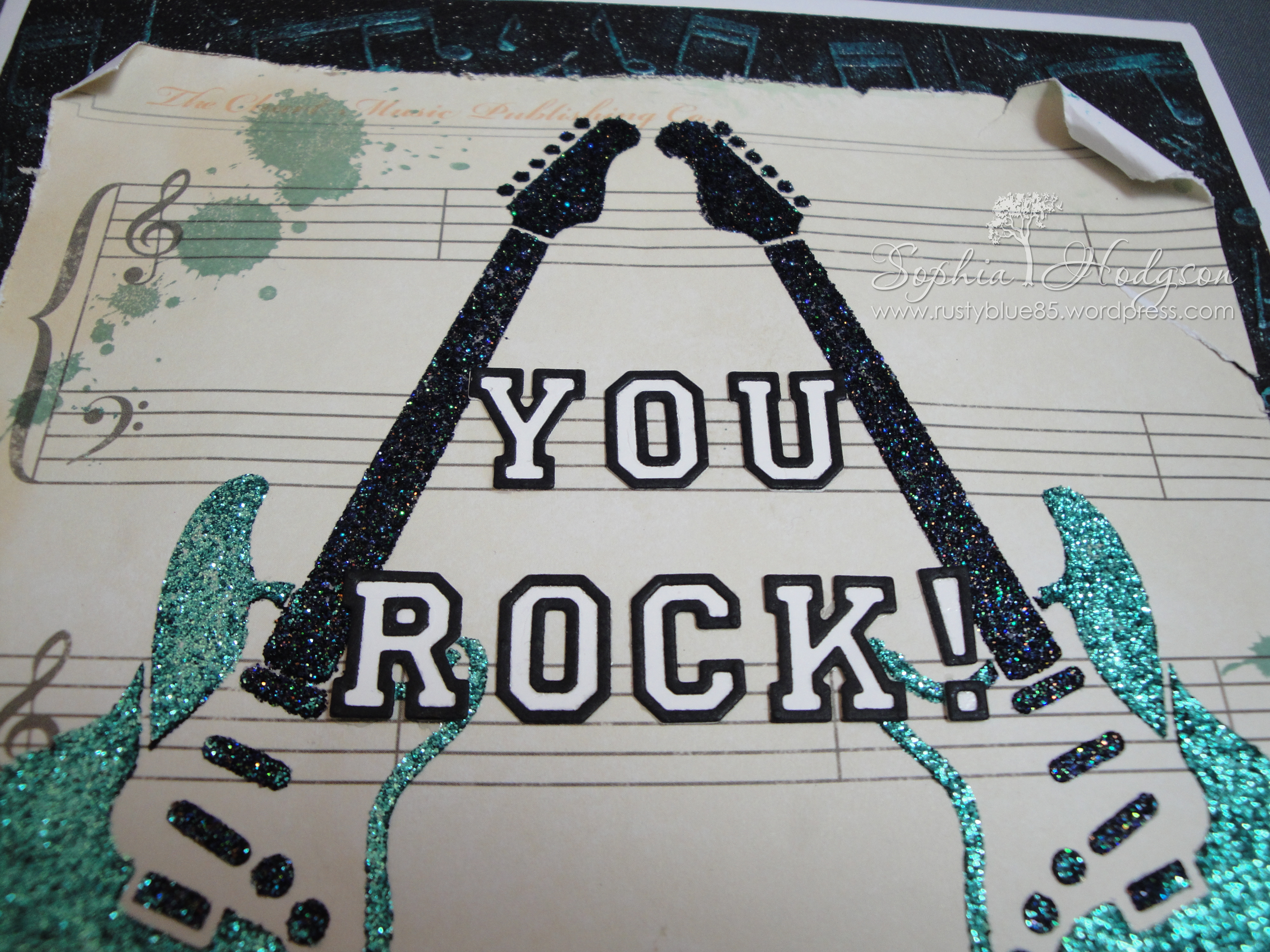 Next the patterned paper with the paste guitars was attached over the top of the embossed pane. Because of the uneven surface created by the sparkle texture paste I attached the letters with Hi-Tack very sticky glue.