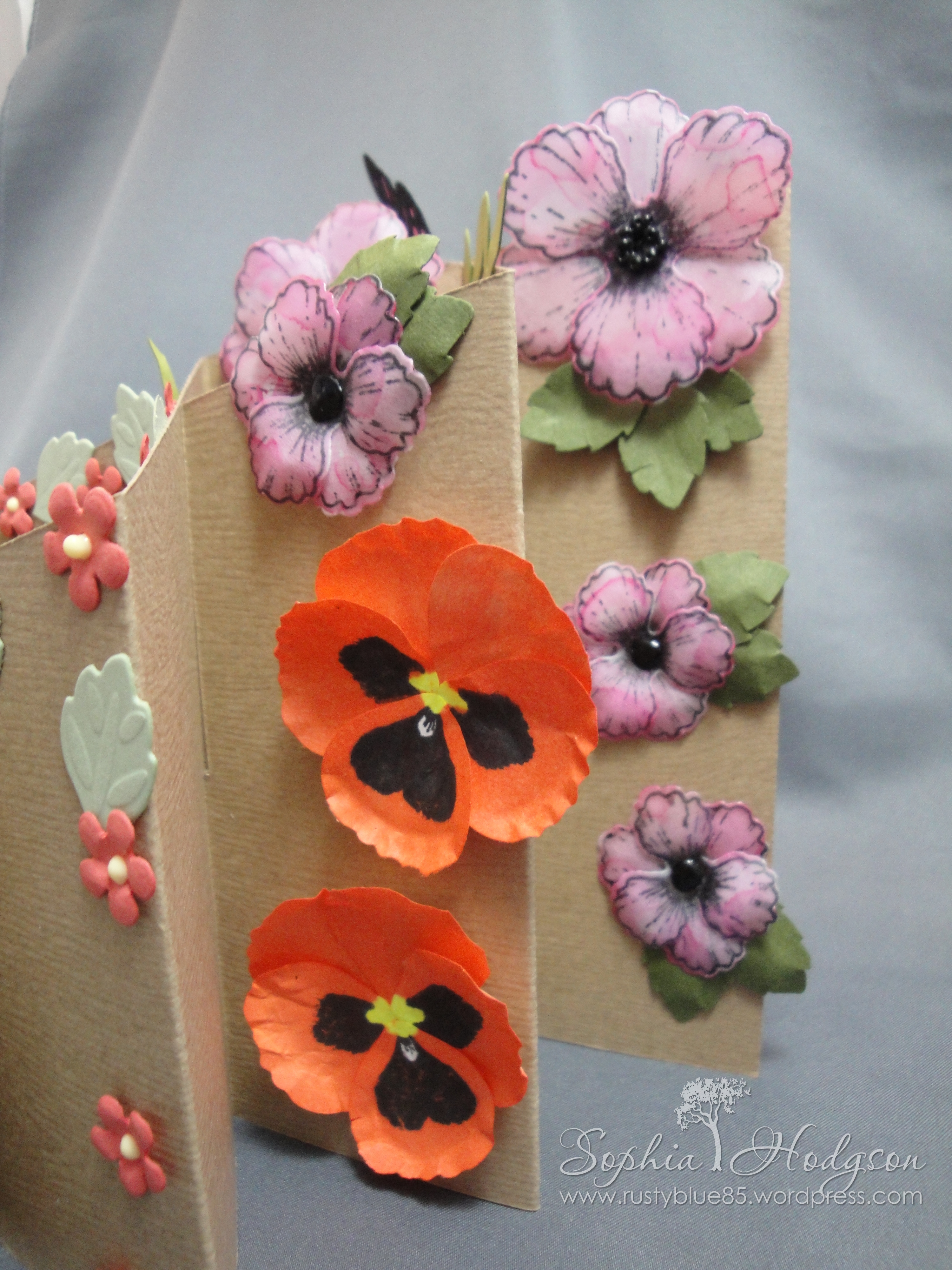 For the back of the card I cut a piece of white card to fit on the right hand panel and stamped the ‘Happy birthday’ sentiment from the Waltzingmouse ‘Say it With Style’ stamp set and used roll-on glue to attach it to the back panel before too many flowers were added to the front panels and it would have been difficult to write on.