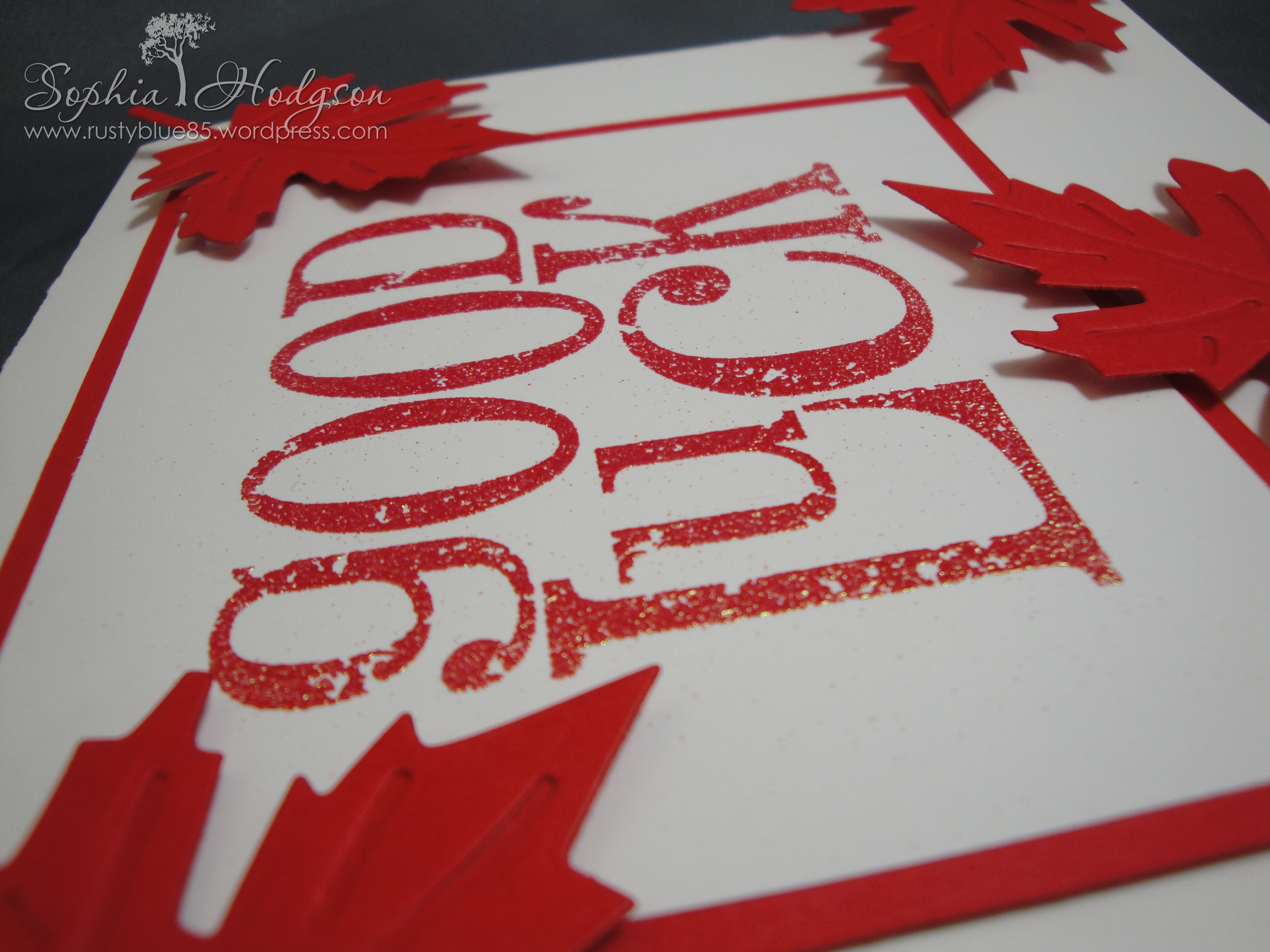 Using the Lili of the Valley ‘set 44 Just to Say’ sentiment stamp in VersaMark watermark ink and Cosmic Shimmer embossing powder ‘Tropic Red Blaze’ on Whisper White card stock. The embossed panel was layered on red card and I used my perfect layers tool to create the red mat. The maple leaves were also cut from red card using Xcut dies.