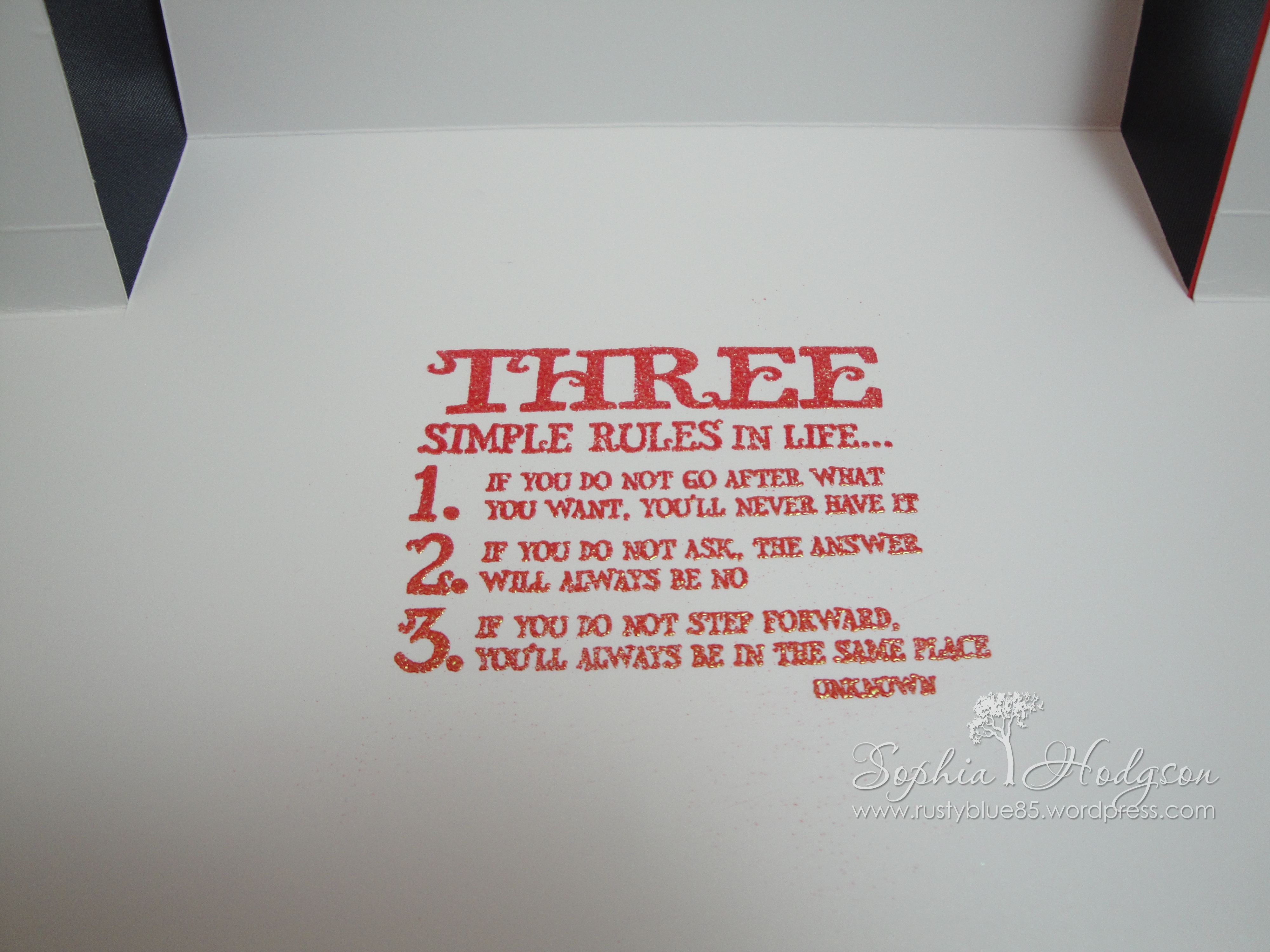 Inside the card I stamped the Lili of the Valley ‘set 63 Quotables – Go For It’ sentiment in VersaMark ink and ‘Tropic Red Blaze’.