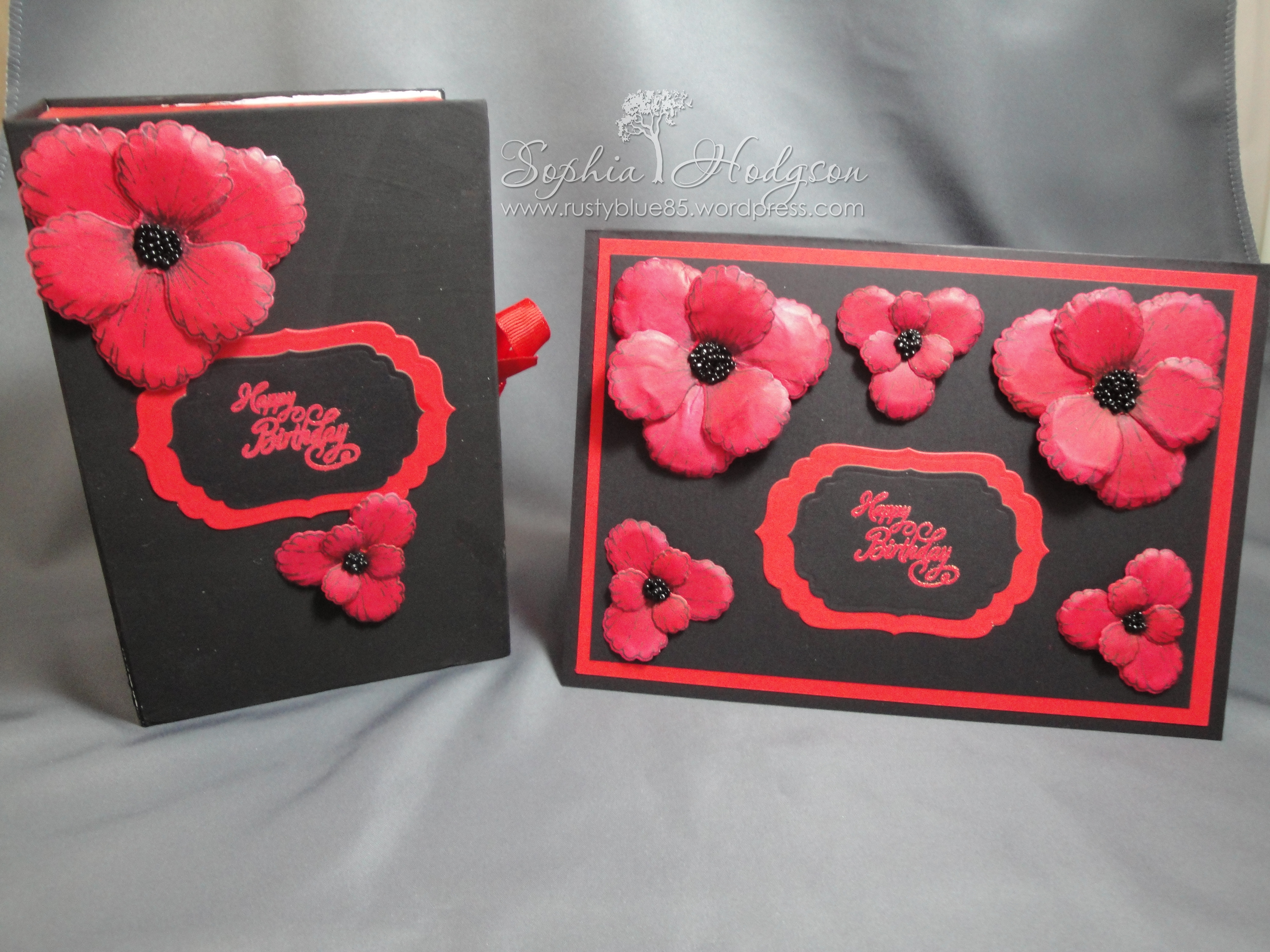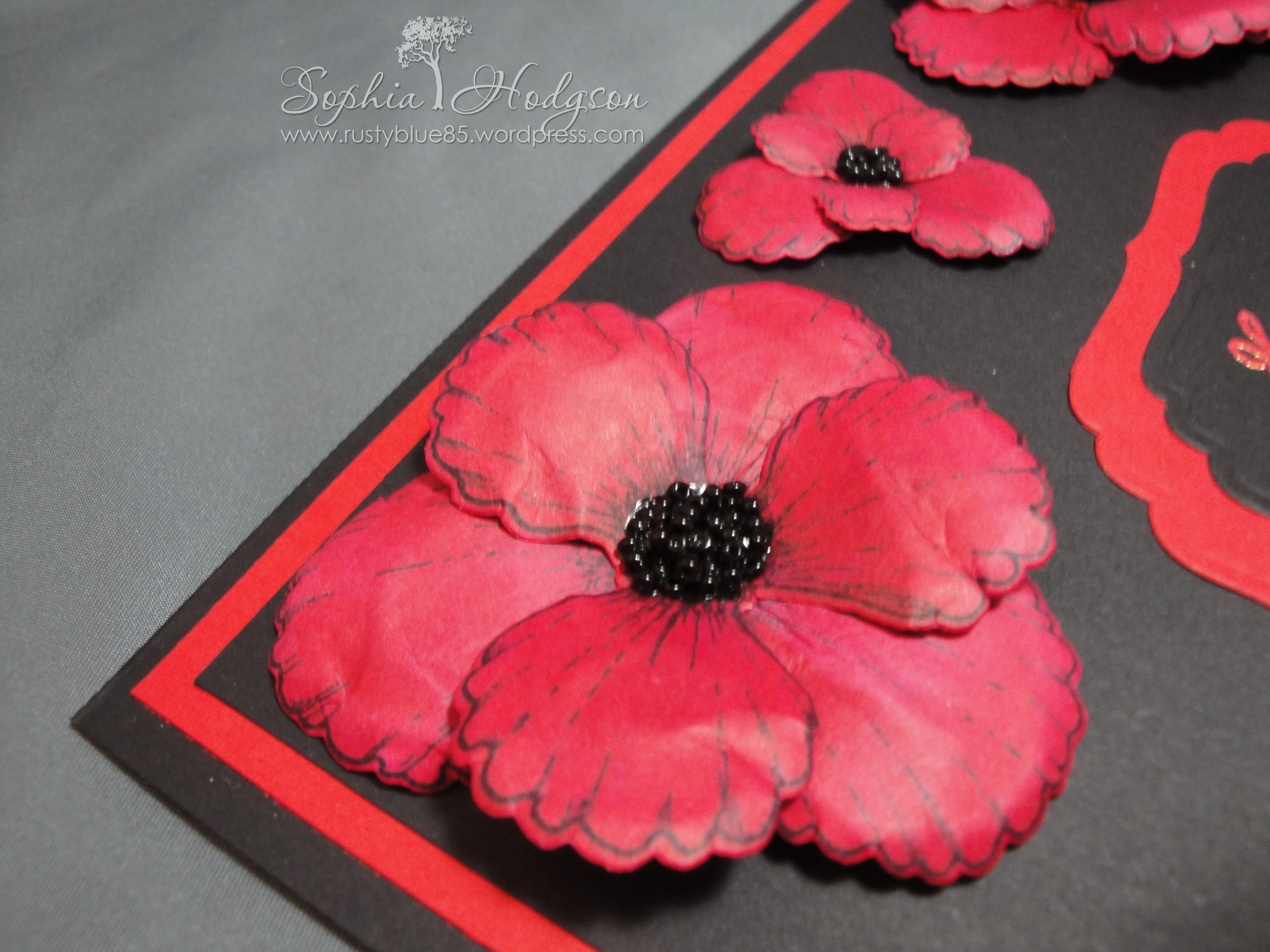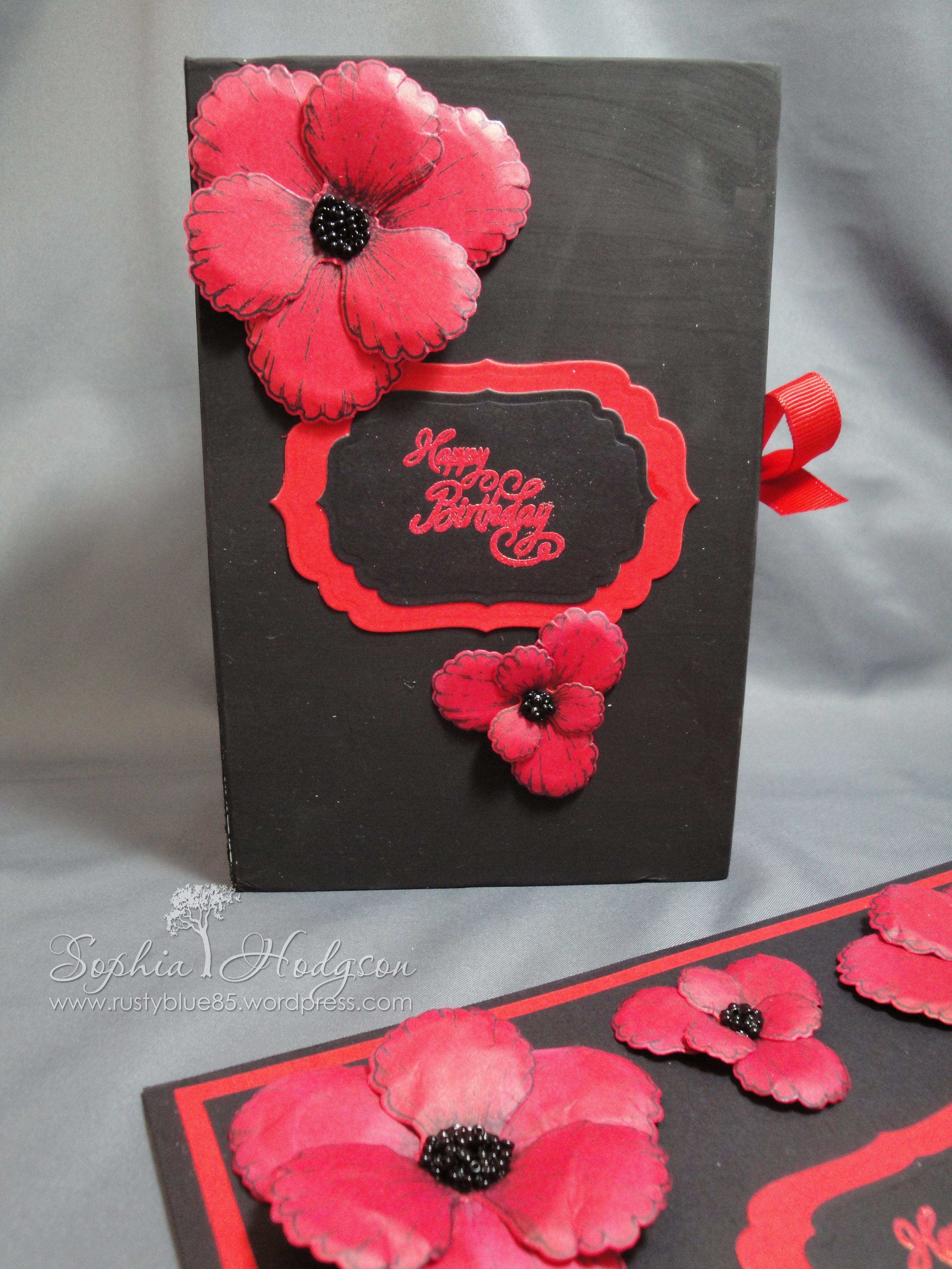 I adhered the poppies to the box and the card front, along with the layered labels.