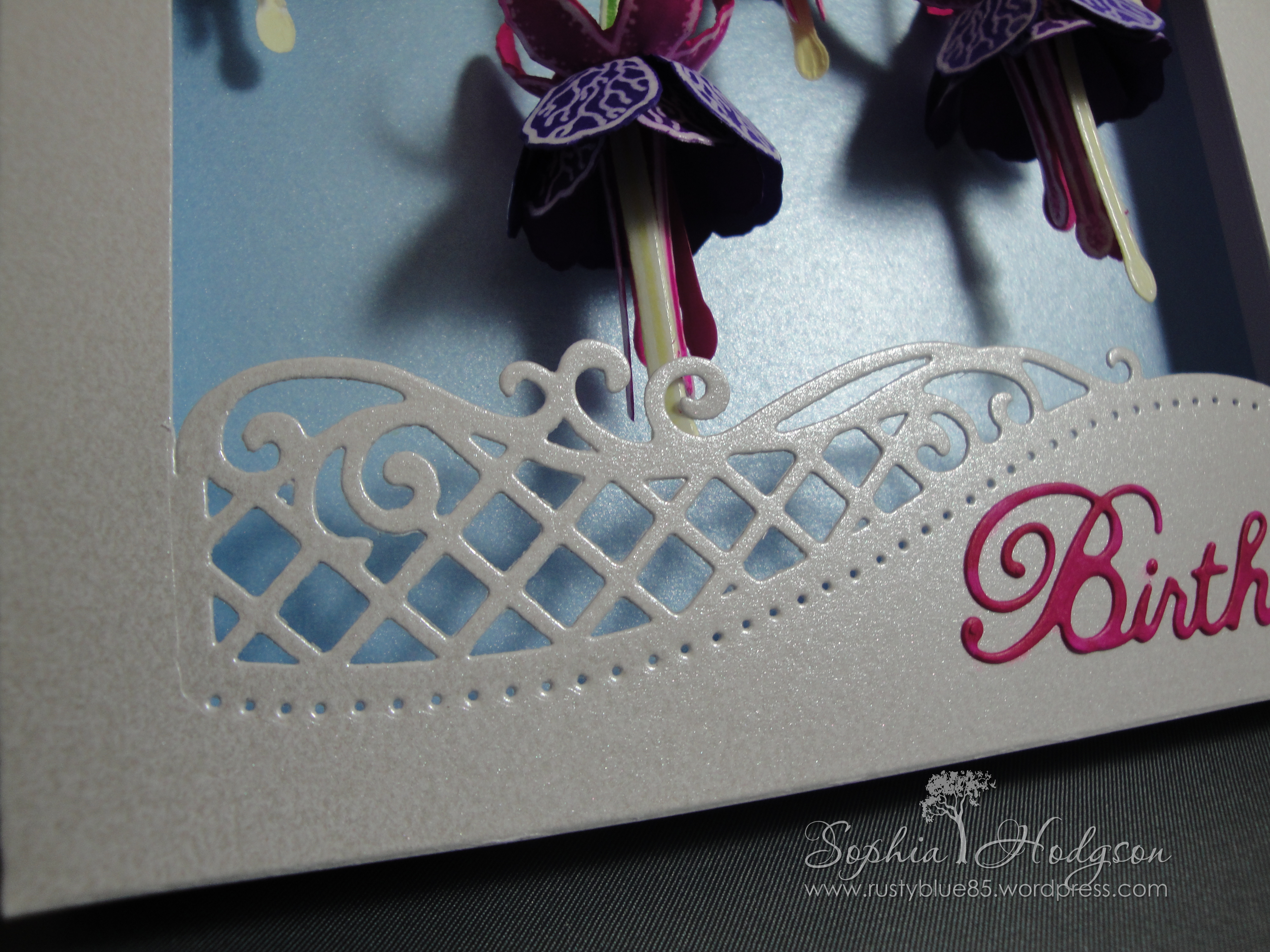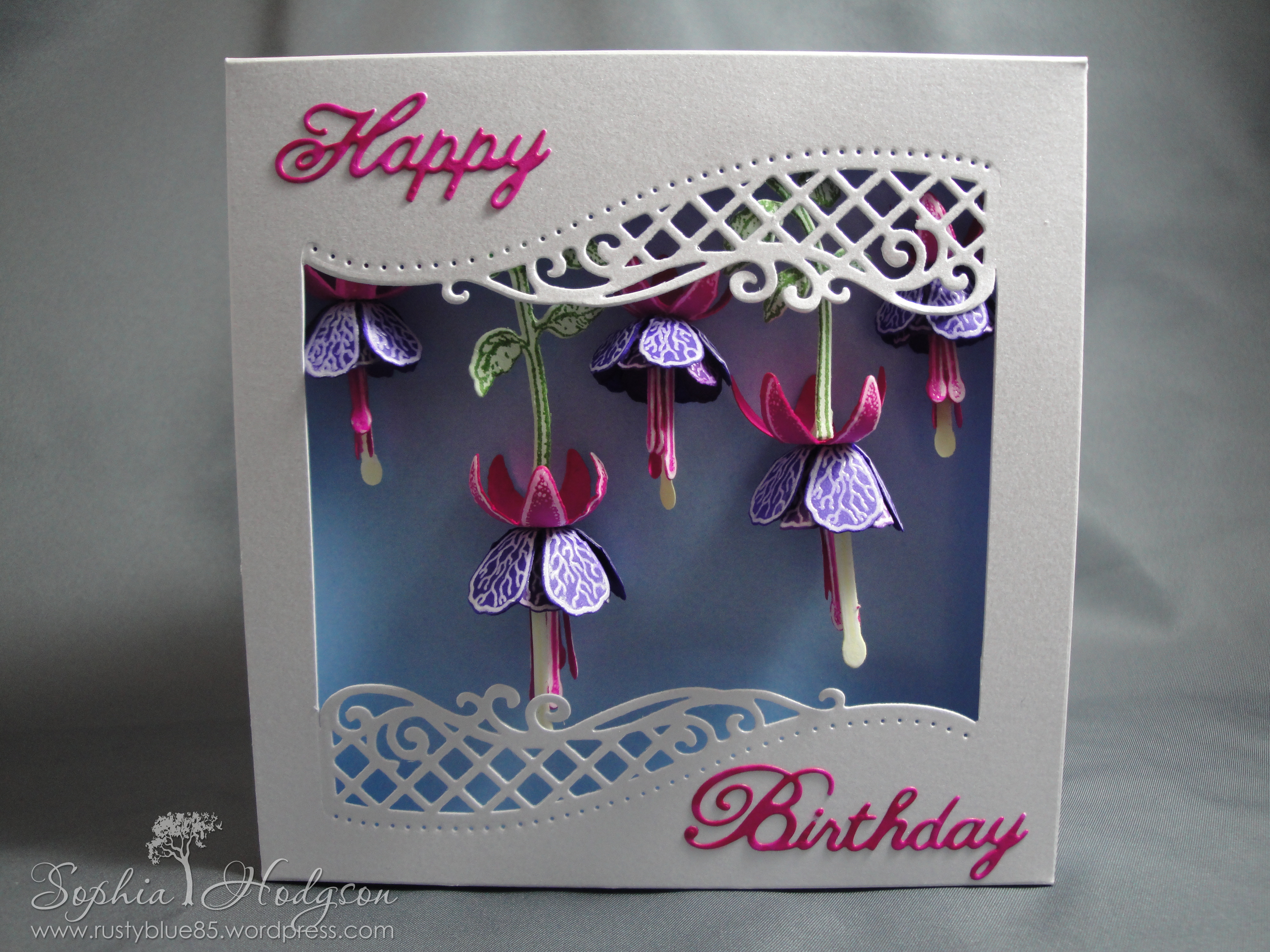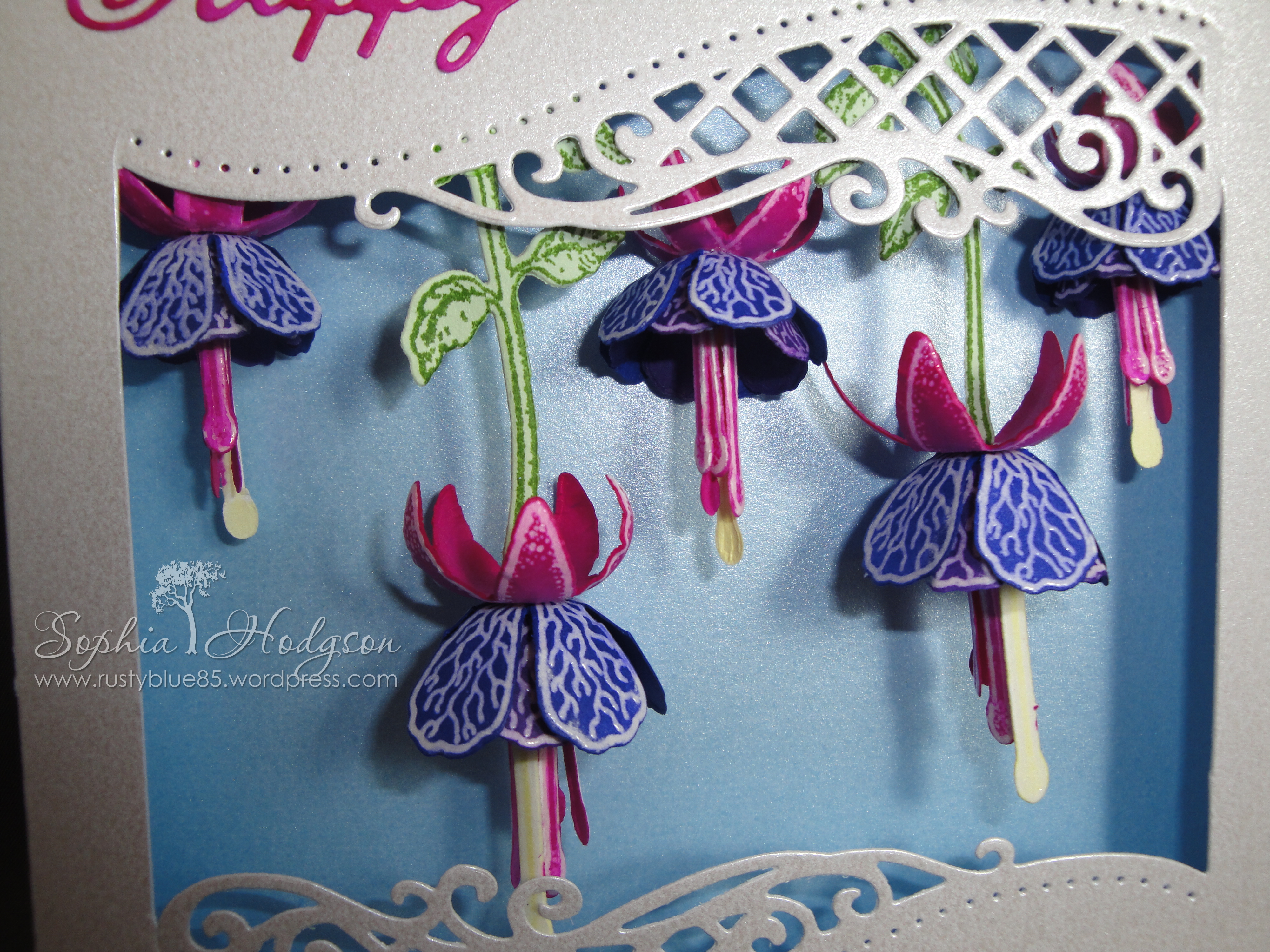 Now I had the flowers, they needed a card to go on! I bought the Crafter’s Inspiration Issue 8 magazine and it came with an exclusive die; the Edge’ables ‘Lattice Flourish’. I wanted to create a window with the die that the fuchsias could hang inside, so I cut the die from some A4 Centura Pearl Snow White card, then used my paper trimmer to cut down from both edges of the die, flipped the die and cut out the bottom of the window. Then I scored around the ‘window’ to create a frame that would stand proud of the card front. I used Hi-Tack glue to glue all the bits together, except one side. I cut a piece of light blue Centura Pearl card to go behind the fuchsias and slid this in the last open side, then glued it all in place.