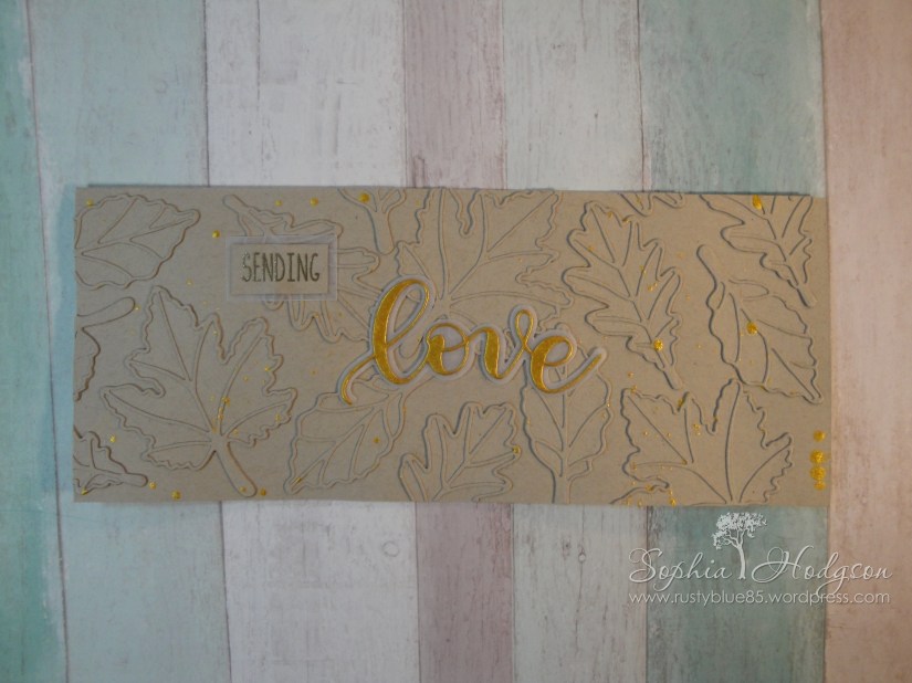 I heat embossed the sending from Honey Bee Stamps ‘Hey Pumpkin’ stamp set with Stampin’UP! gold embossing powder on Neenah Desert Storm. Because the sending and love weren’t standing out enough from the background I created vellum outlines for them and used vellum backed with stick it adhesive sheet.