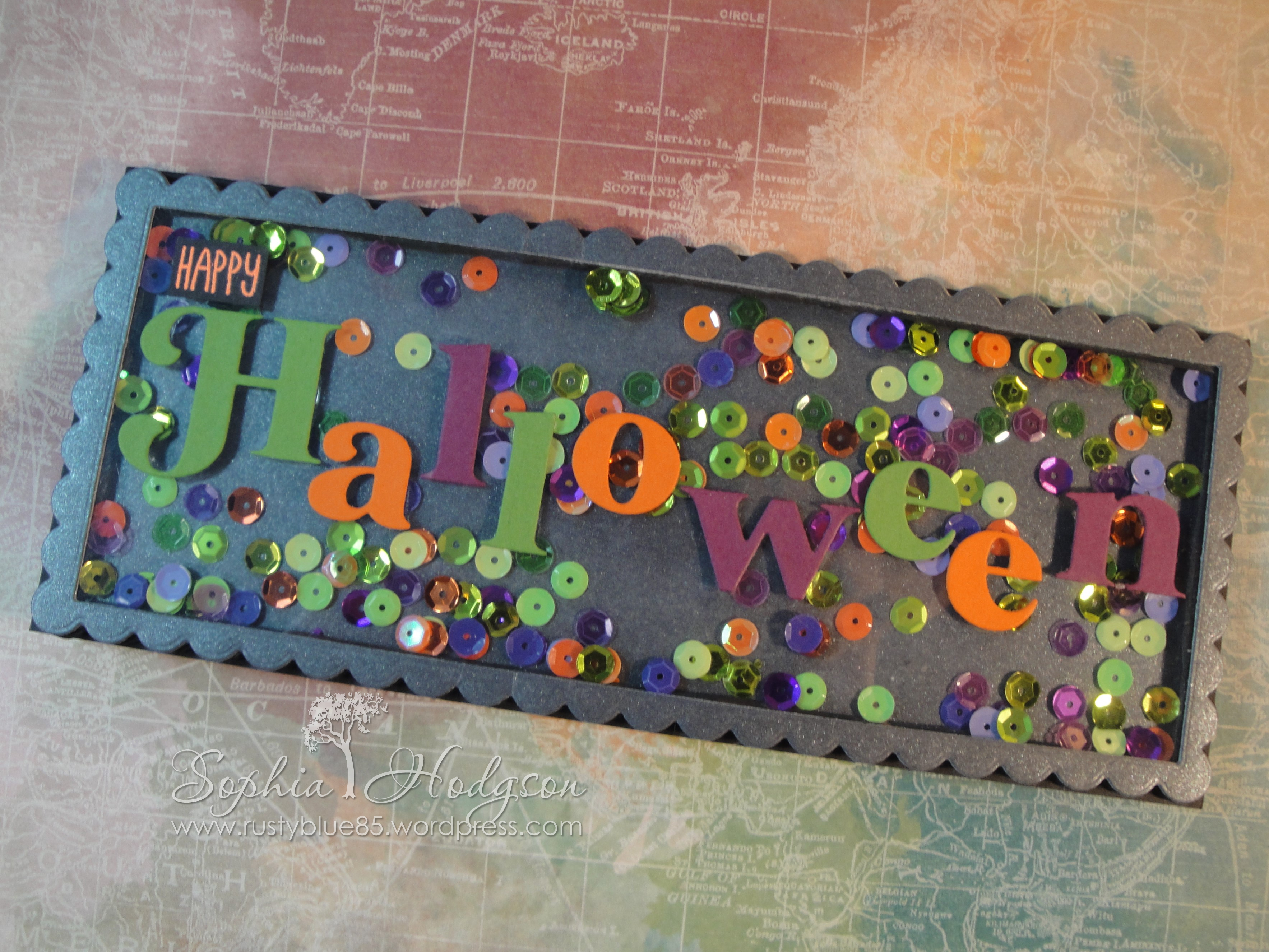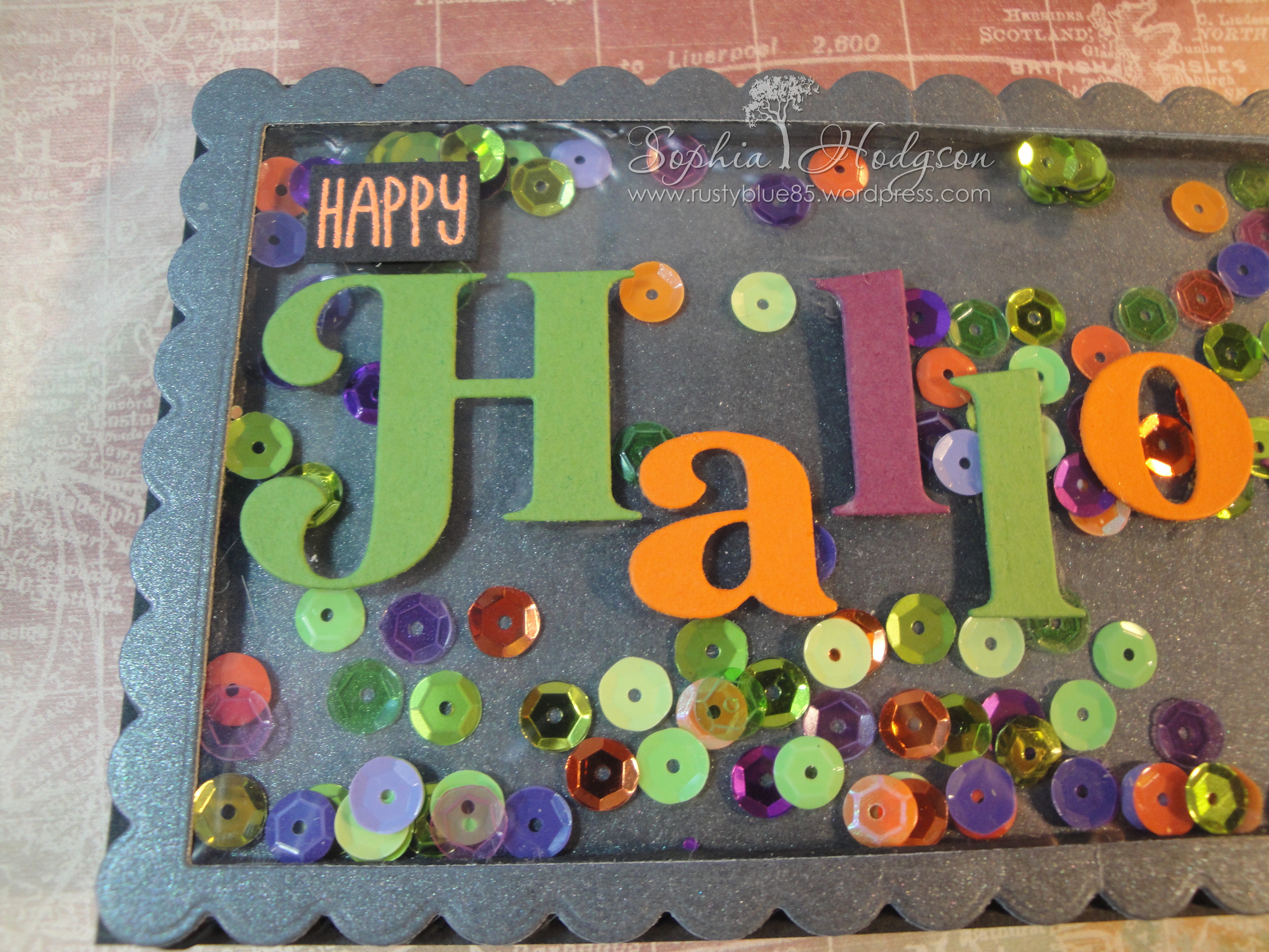 I filled the shaker with sequins, then adhered the metallic black scalloped rectangle to the back of the shaker to seal the whole unit. Next I adhered the sentiment to the front of the acetate with liquid glue, but I should have done this before I added the foam frames because it was really difficult trying to hold the letters down without them slithering all over the acetate and making a mess!